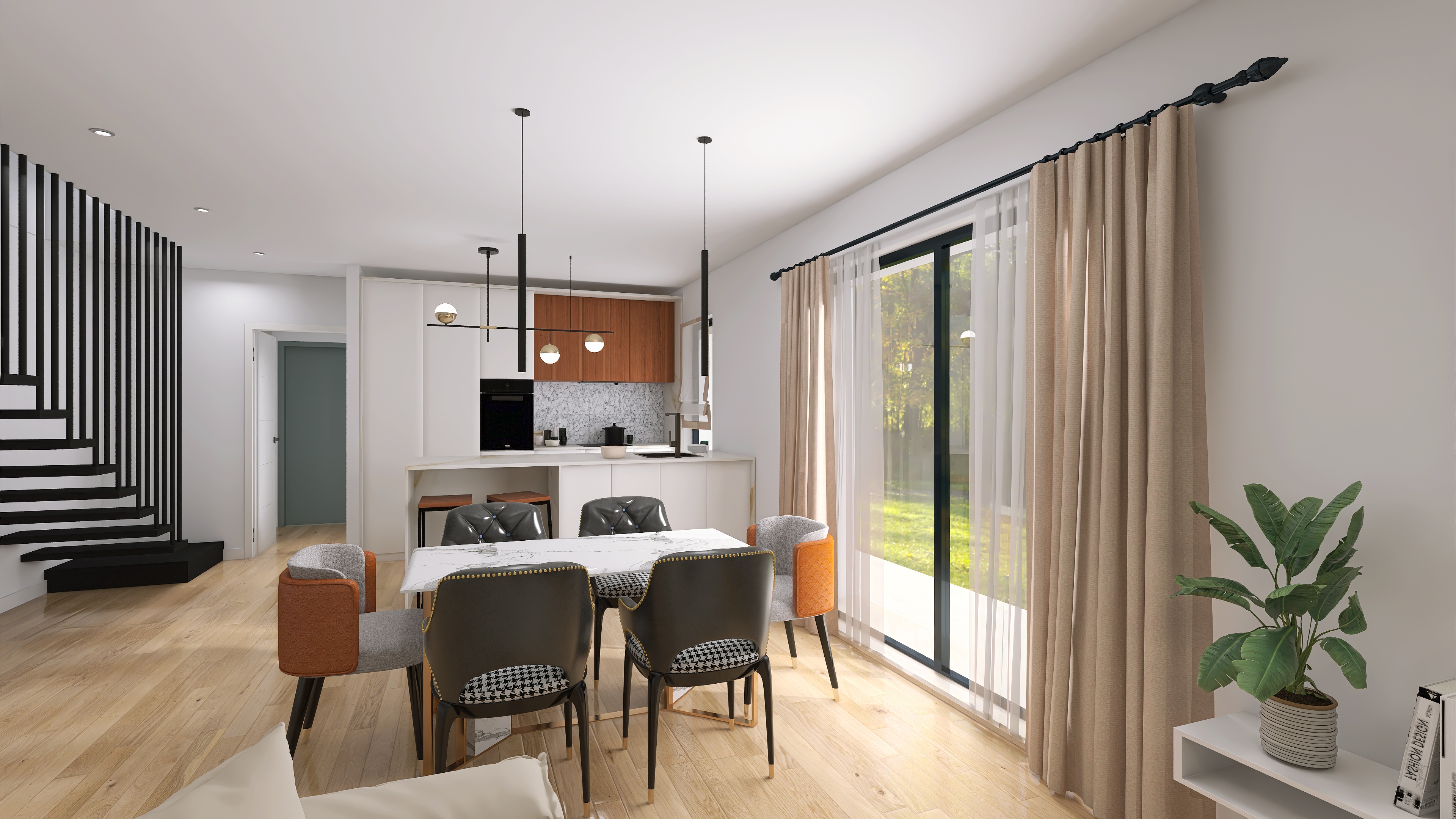 render a modern elegant kitchen and dining area bathed in natural light the walls are a soft white complemented by beige curtains that gently frame a large sunlit window the kitchen cabinets have a warm wooden finish with black pendant lights hanging gracefully the dining table is surrounded by mixed chairs some with deep gray upholstery others with a vibrant orange and gray combination the floor is a light natural wood adding warmth to the scene a potted green plant adds a touch of nature creating a cozy welcoming atmosphere