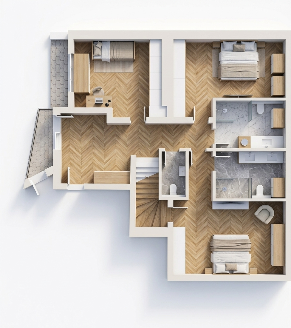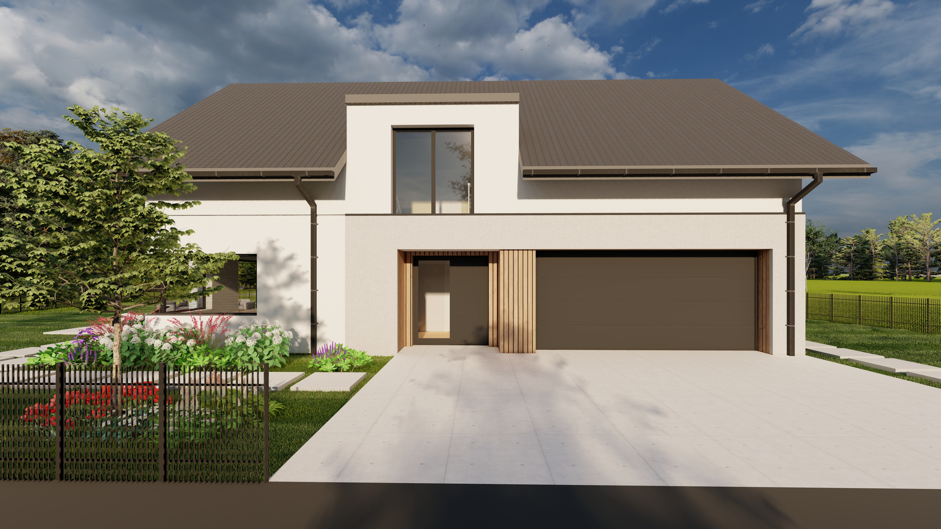 modernist exterior shot create a realistic rendering of a modern house in a peaceful suburban setting the house features a white facade and a dark gray pitched roof with flat tiles do not change the color of the door or the garage gate and keep the current shape of the gutter enhance the realism of the existing greenery making the young tree and plants look more natural without adding any new vegetation outside the current area the driveway and path are made of light gray concrete tiles the sky is partly cloudy with a soft blue tint casting gentle realistic shadows the overall atmosphere is calm and inviting do not change the texture of the white facade do not change the appearance of the front door or the garage gate including their color or the way they open architecture