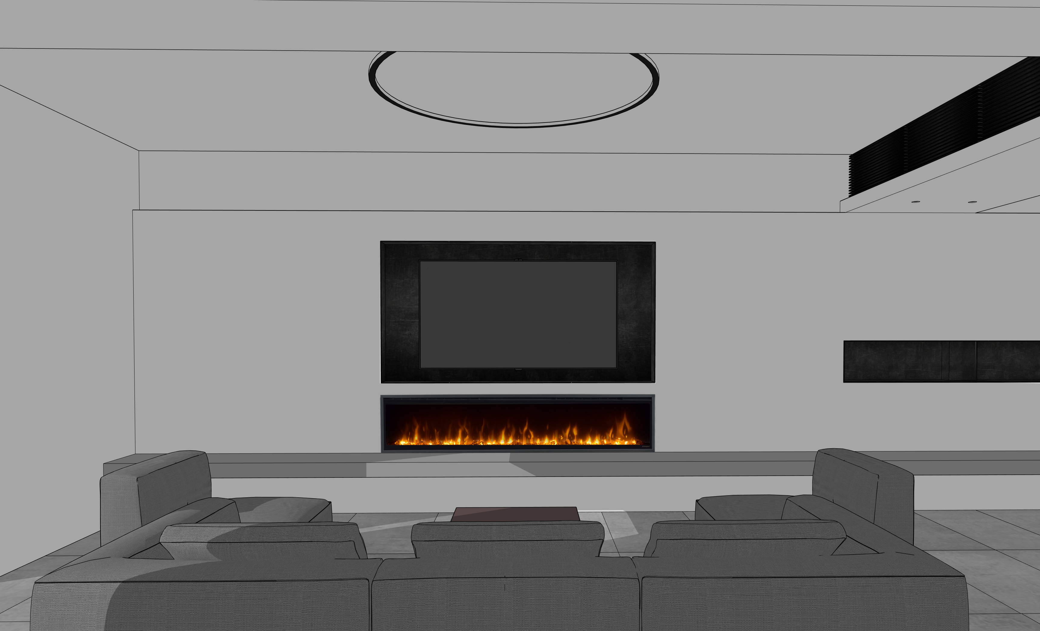modern minimalist living room interior camera facing a wall with built in rectangular niches preserve exact geometry and layout from input image same proportions and composition natural daylight entering from the left side of the image primary light source on the left clear directional lighting soft shadows cast towards the right realistic light falloff across the space built in wall niche with a flat screen tv and a linear electric fireplace below warm realistic fire glow subtle light emission from the fireplace adjacent rectangular niche on the right used as shelving clean minimal design all niches clad in dark metal panels black steel matte finish realistic material texture continuous grey base bench below the niches smooth finish hidden led strip lighting under the upper surface of the niche soft warm indirect light illuminating the wall subtle glow neutral color palette soft ambient lighting architectural photography photorealistic high detail materials clean composition no redesign no extra objects