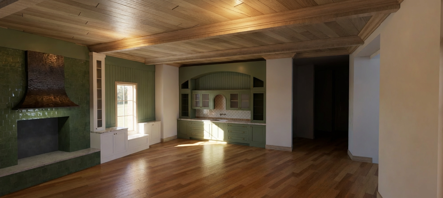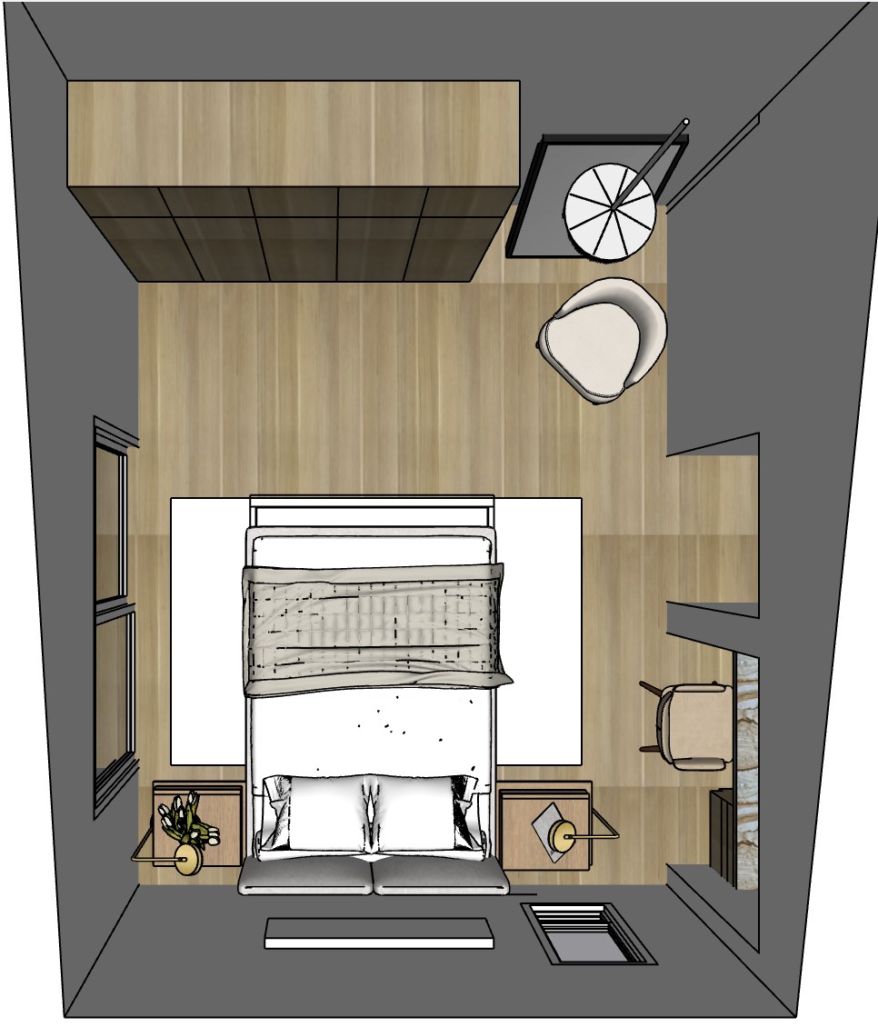 create photorealstic overhead view of this guest bedroom keep all space plan and parameters where they are in image keep light oak finishes on floor and cabinetry add texture to rug keep colors modern and add natural light coming through sliding door keep space plan exact add reflection to leaning mirror near chair add light to seaglass chandelier hanging over chair