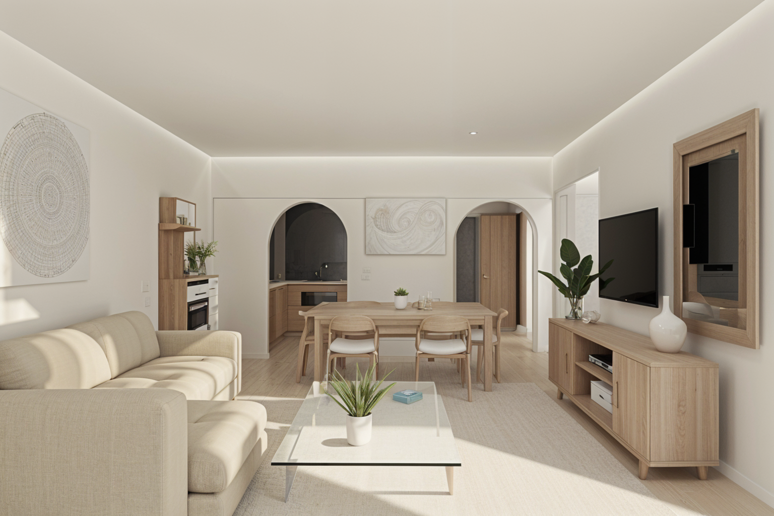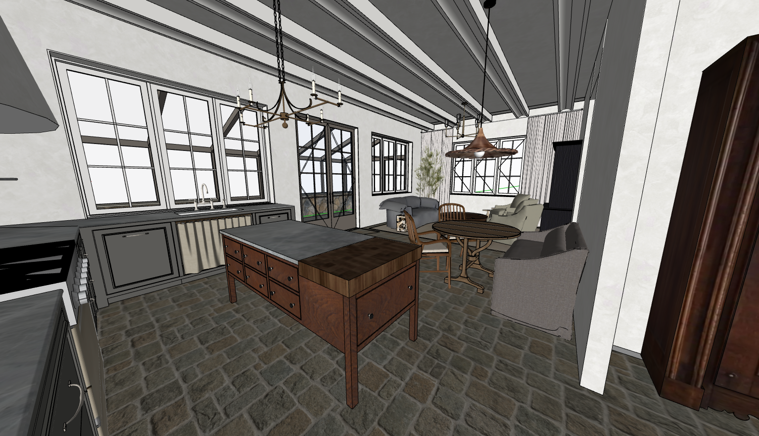 mediterranean revival interior shot render a cozy rustic kitchen with a warm and inviting atmosphere use soft cream walls and white window frames to create a bright ambiance feature a brick patterned floor in earthy brown and gray tones include wooden elements such as a rich mahogany kitchen island and a dining table adding depth with a dark walnut finish enhance the room with plush gray armchairs and a soft beige couch for comfort set a copper pendant light for a vintage feel casting a soft warm glow incorporate black and white cabinetry for contrast with brushed steel appliances adding a modern touch add a subtle potted green plant for a hint of nature ensuring an overall harmonious and welcoming space architecture