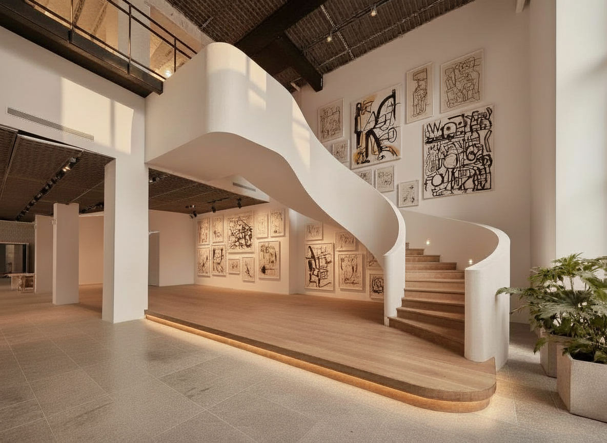add a long rustic wood communal table in the foreground with 15 modern high end designer chic white chairs