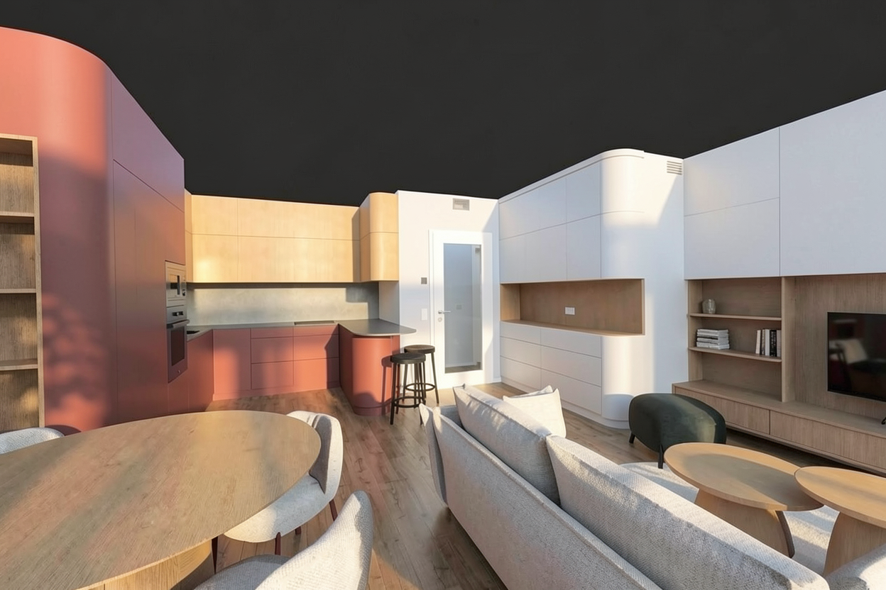 render a modern kitchen interior with a refined and elegant atmosphere use rich dark walnut wood for the cabinets and island the countertops and the backsplash both under and on top of the floating wall units should be a light microcement matt finish the pendant lights hanging above the island are black and intricately designed casting delicate shadows the chairs around the white round dining table are upholstered in a soft off white fabric paired with minimalist black metal legs through the large sliding glass doors display a lush green garden full of vibrant foliage basking in soft afternoon sunlight the walls are smooth and light gray enhancing the clean contemporary japandi feel
