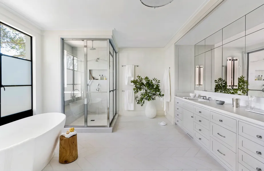 design a spa inspired modern bathroom featuring natural materials like stone wood and bamboo with a neutral calming color palette of soft beiges creams and warm grays include a freestanding bathtub a walk in glass shower with rain showerhead floating vanities and soft ambient lighting incorporate greenery plush towels and minimal d cor to create a serene relaxing and luxurious retreat