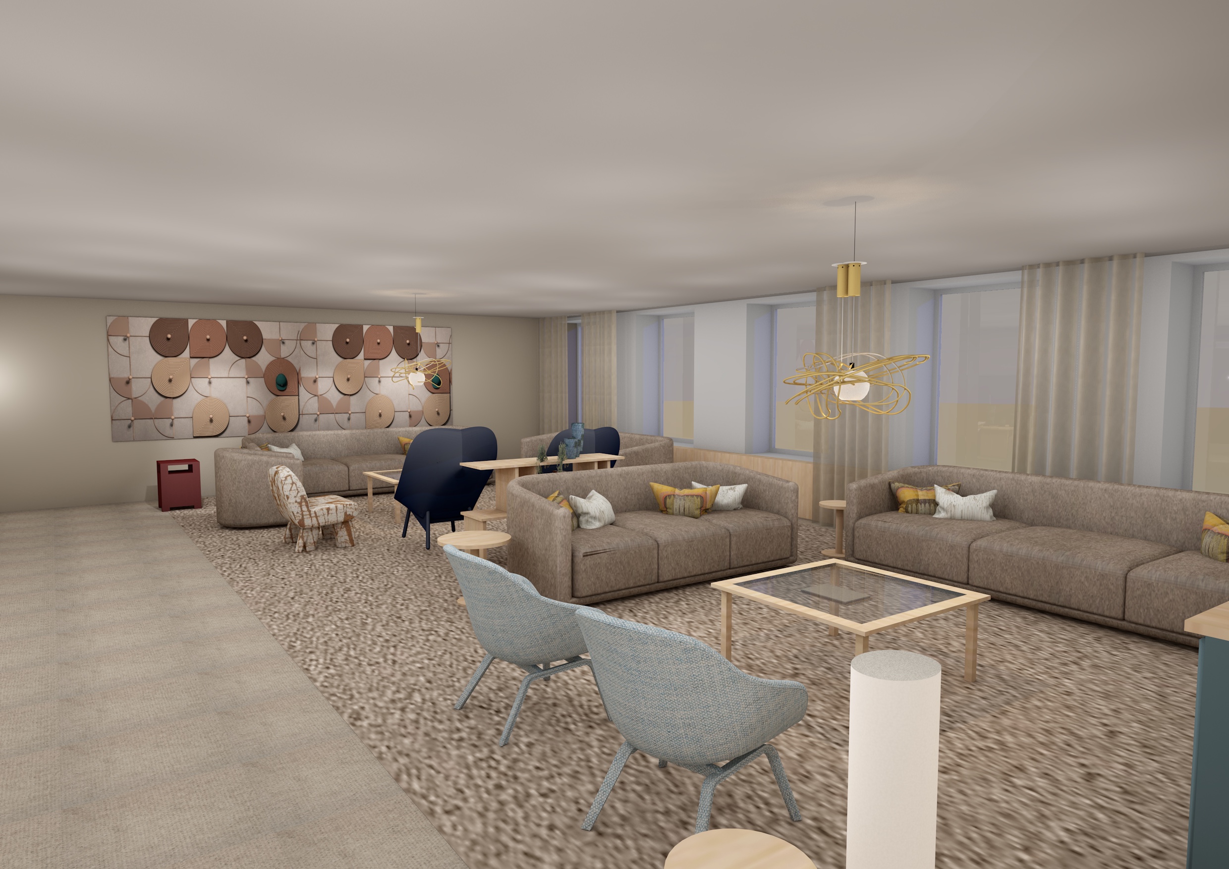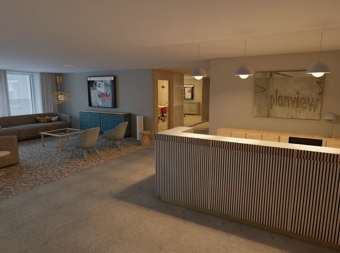 make it more realistic and not too dark but slightly warmer make the lamps over the reception be lit up let the painting on the back wall be a abstract painting with inspiration from the planview logo