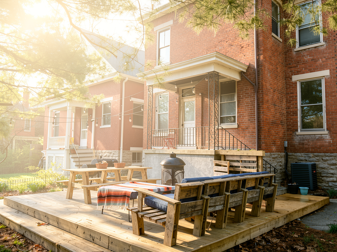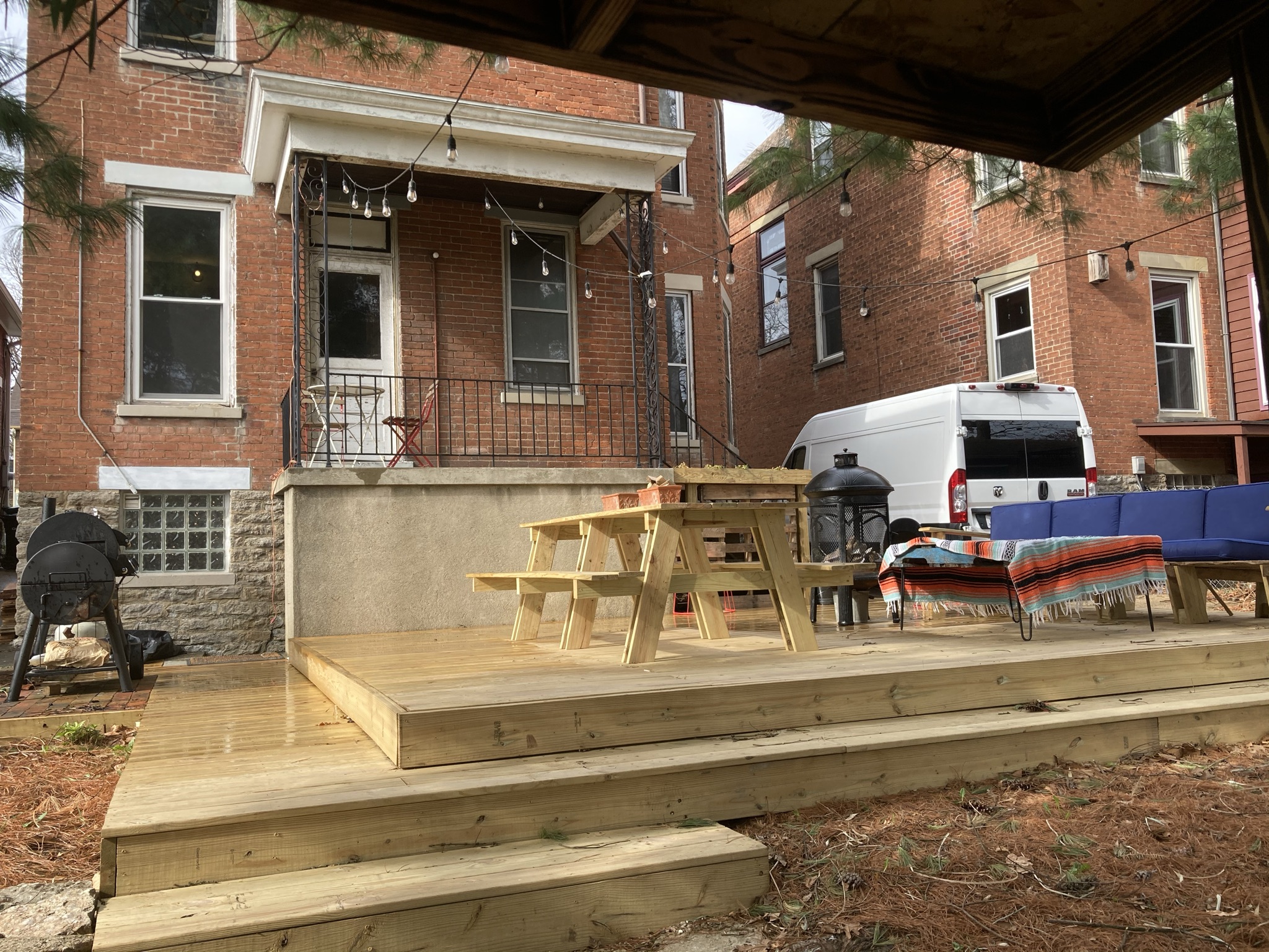 edit these photos to make them look like professional landscape architecture photos of a back yard deck design project make them ethereal and beutiful but keep the design to show off my work add a few people remove van and add planting in planting beds blur context to highlight the design