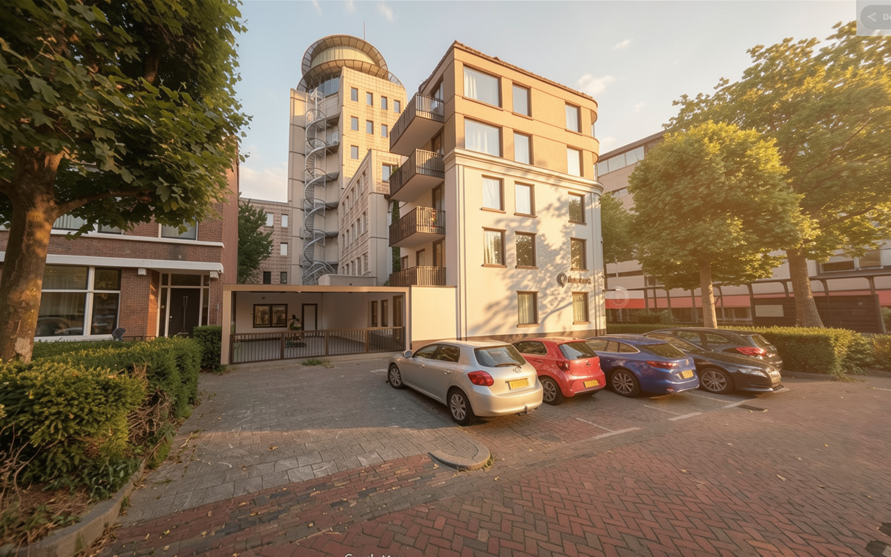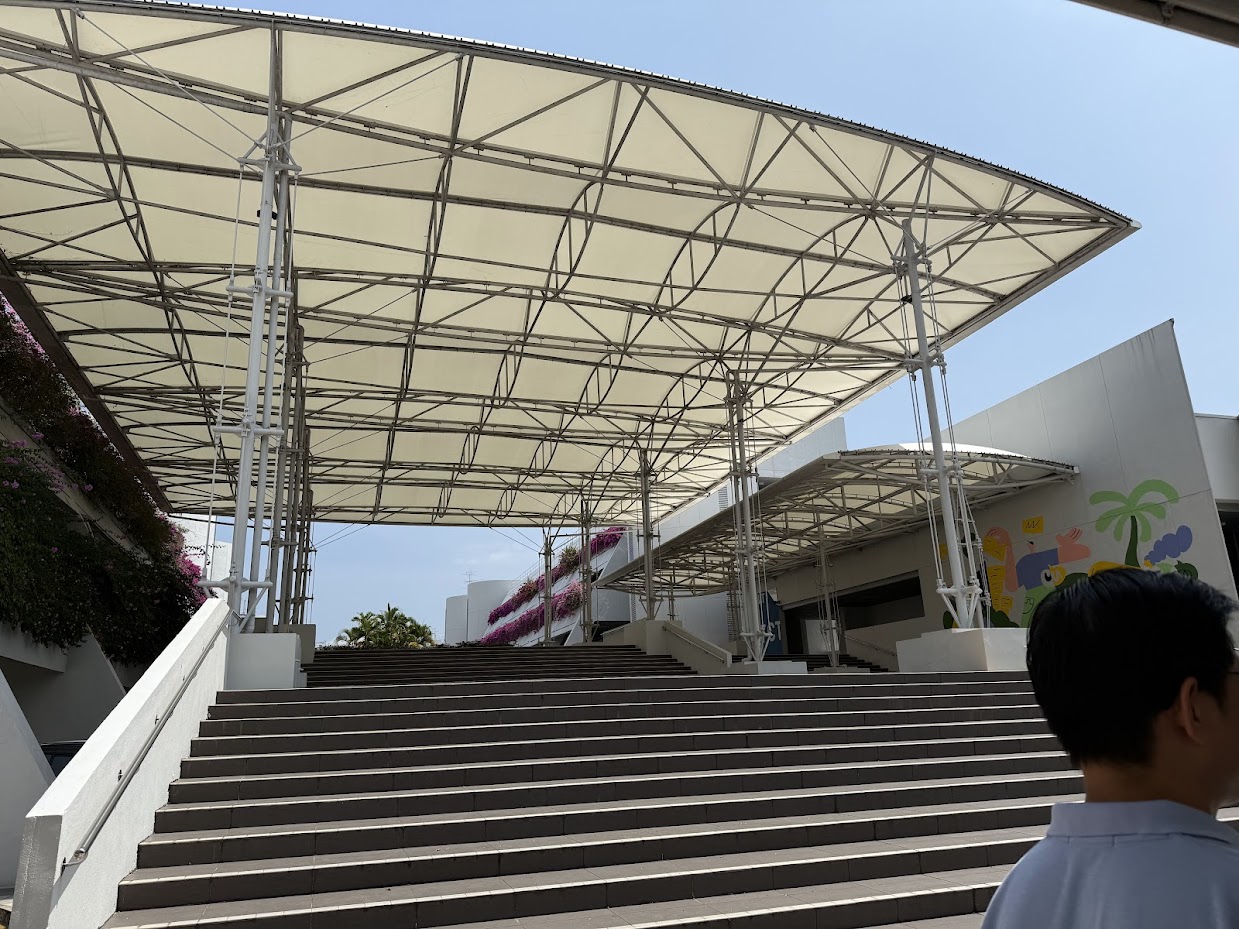 exterior shot to change the etfe canopy to a enginerred timber etfe canopy like the reference keep the building at the sides the same to have two escalators at the left side of the grand staircase to have timber seating and and tree planter boxes scattered at the grand staircase