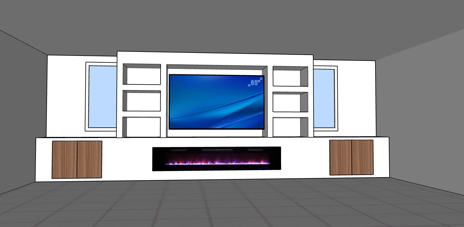 create a 3d render of this tv media wall add led lighting insides the shelves walls are white tv unit buildout is white cabinets on bottom are light walnut wood tone keep windows on sides tv buildout reaches ceiling height through windows is a south florida summer view