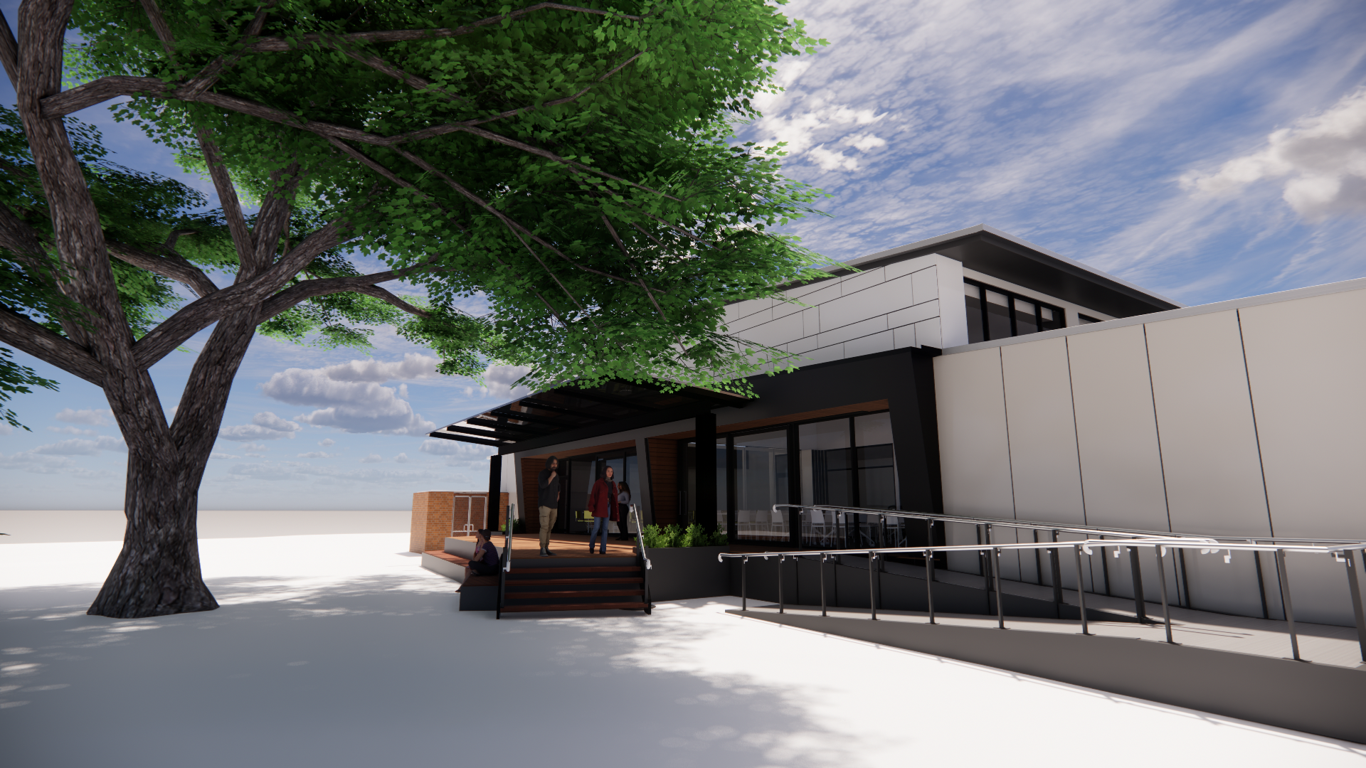architectural visualization render enhancement photorealistic post production quality enscape and revit base render upgraded to hyperrealistic output do not alter the overall building design or existing tree placement stabilized granite ground surface with natural aggregate texture and subtle tone variation matched to existing broom finish grey concrete in front of the deck scattered granite boulders of varying sizes integrated naturally into landscaping away from existing tree bases with minimal boulder presence near trees contemporary timber or concrete bench seating placed organically throughout the space low maintenance native garden beds with ornamental grasses succulents and ground cover plantings sparse population of senior college students aged 17 19 walking casually through the space small groups of two or three max natural relaxed body language no overcrowding authentic lifestyle feel warm soft daylight with realistic sun shadows and ambient occlusion architectural photorealism style sharp building materials with accurate reflections and surface texture cinematic depth of field with crisp foreground and softly resolved background 16 9 landscape format 8k ultra high resolution professional architectural cgi quality