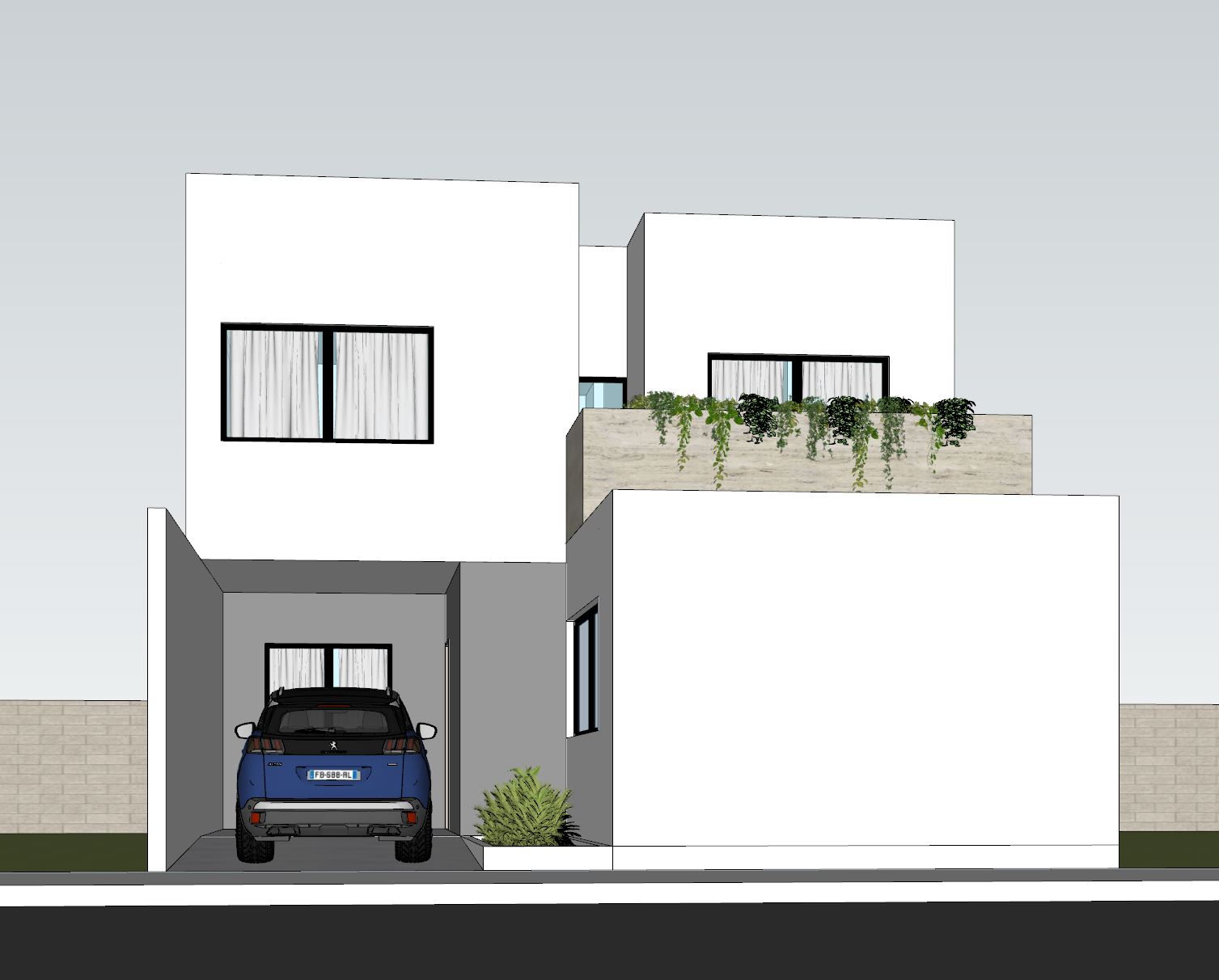 create a hyper realistic render of a modern minimalist two story house with clean white volumes and sharp geometric lines the main fa ade should match the reference image composition featuring a small balcony on the upper right side with travertine stone cladding and lush green hanging plants the lower area includes a covered garage with a dark colored suv parked inside render it on a bright sunny day with soft warm daylight and gentle shadows add a slightly blue sky with some scattered clouds for a natural and realistic atmosphere highlight the fine textures of the white stucco walls the travertine stone and subtle glass reflections the overall image should feel elegant calm and contemporary emphasizing architectural simplicity and material quality