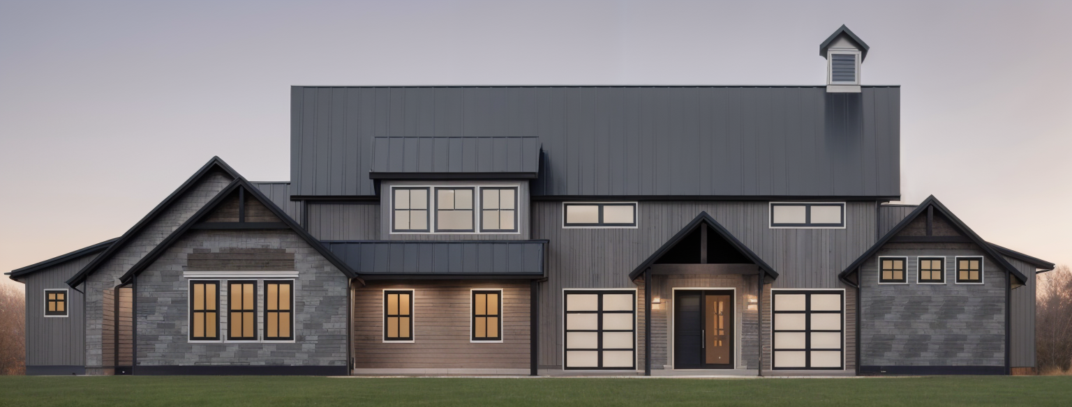 expessionism exterior shot black steel roof dark gray siding gray and white stone and medium brown wood accents architecture