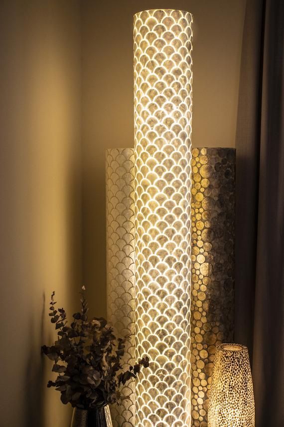 interior shot create a jewellery store interior featuring decorative cylindrical pillars wrapped in illuminated scallop pattern panels the pillars should emit a warm golden ambient glow acting as both lighting elements and design features their soft radiance should highlight nearby jewellery display counters making gemstones sparkle subtly the design should evoke sophistication warmth and luxury blending modern artistry with functional elegance