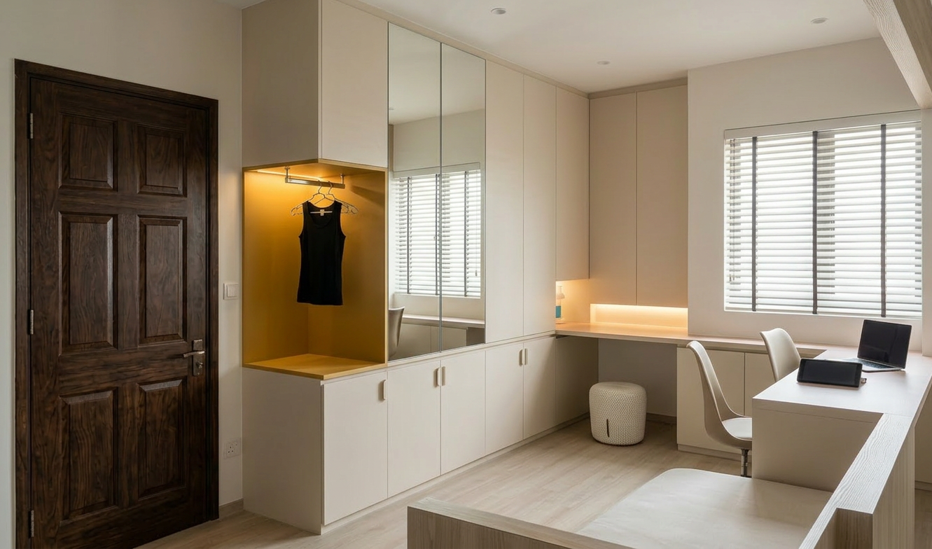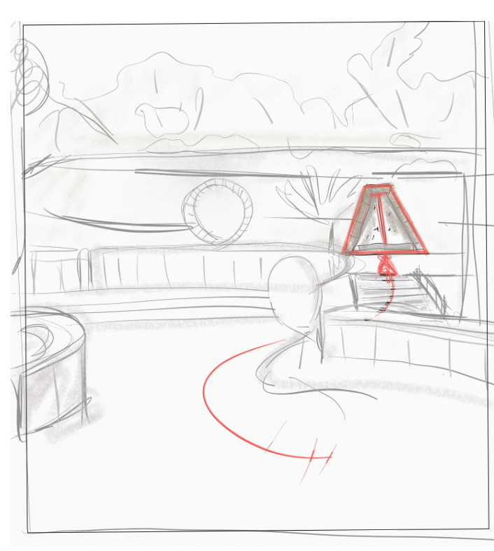 architectural interior render one point perspective underground entry corridor descending into darkness narrow tapering passage approximately 8 feet wide ceiling height starts at 10 feet and compresses to 7 feet as it recedes angled light baffle panels mounted at ceiling entry casting stepped shadow zones that progressively reduce illumination from warm amber at entry to near total darkness at far end two human figures in silhouette descending one closer one further establishing scale and depth walls are raw carved silica sand with visible stratified layers and faint mica sparkle catching the diminishing light floor is compressed earth slightly sloped downward lighting is directional and diminishing warm 5 lux at entry fading to under 1 lux at the vanishing point charcoal and graphite illustration style atmospheric no artificial fixtures visible no text no labels safe somber meditative architectural high contrast between the lit entry zone and the deep shadow at corridor terminus