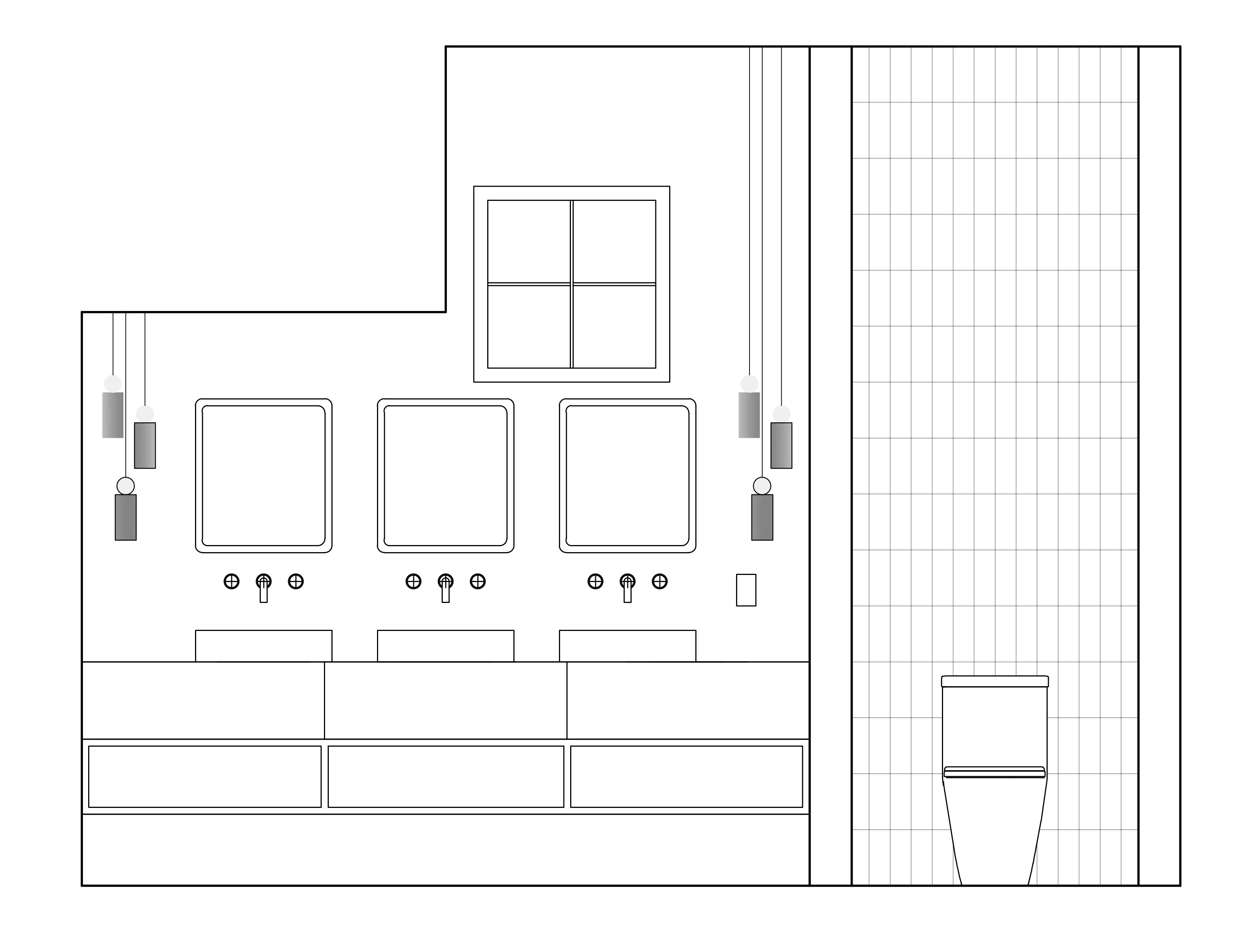 exterior shot natural stone tiles on the floor dark blue tiles behind the toilet terrazzo tiles behind the vanity lighter blue sinks colorful concrete pendant lamps black window frame