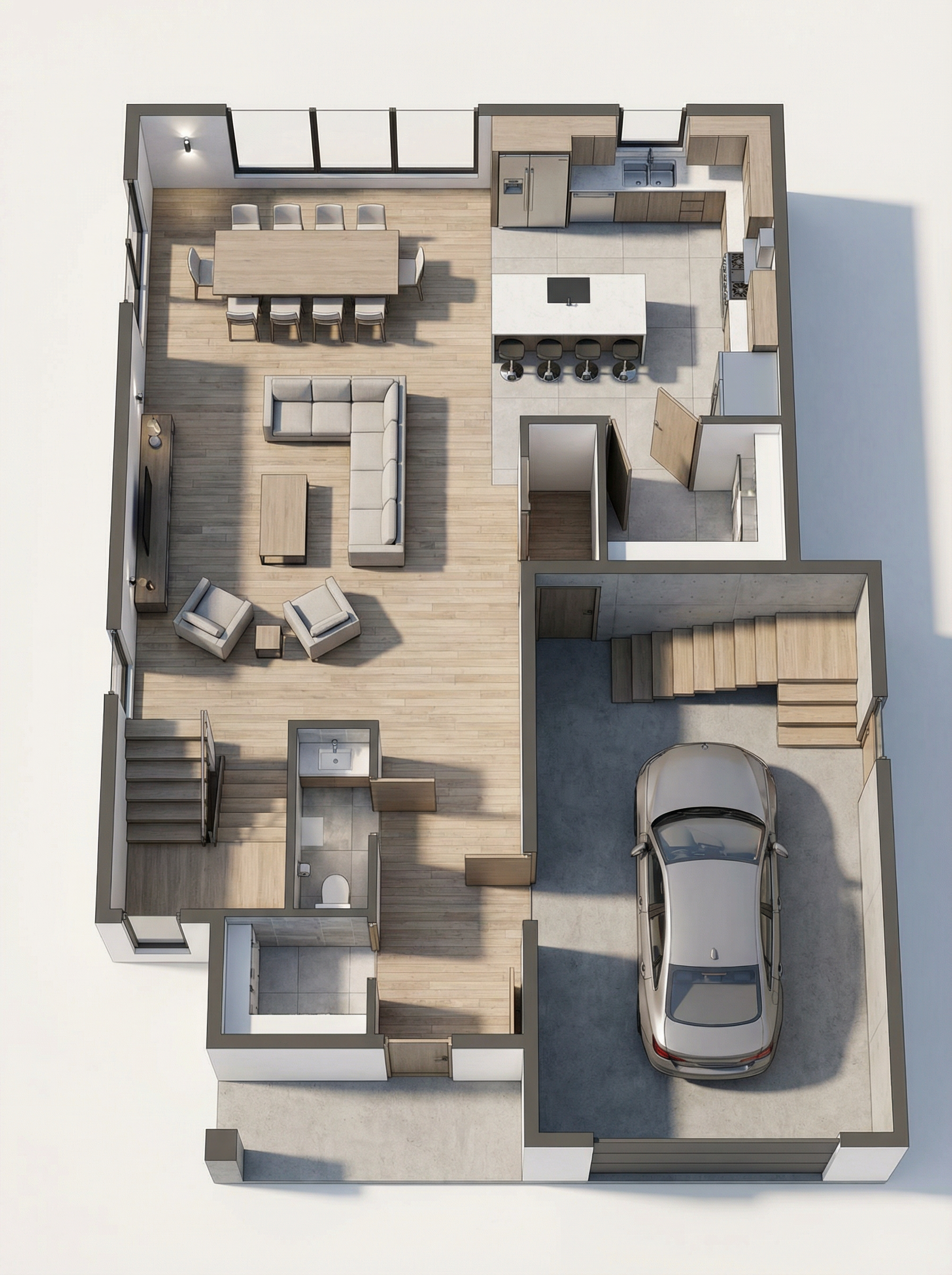 convert this floor plan into a modern isometric 3d view of a full house show the space from an elevated angle with furniture walls and details visible use the same furniture as shows on the plan do not change the orientation of the floorplan