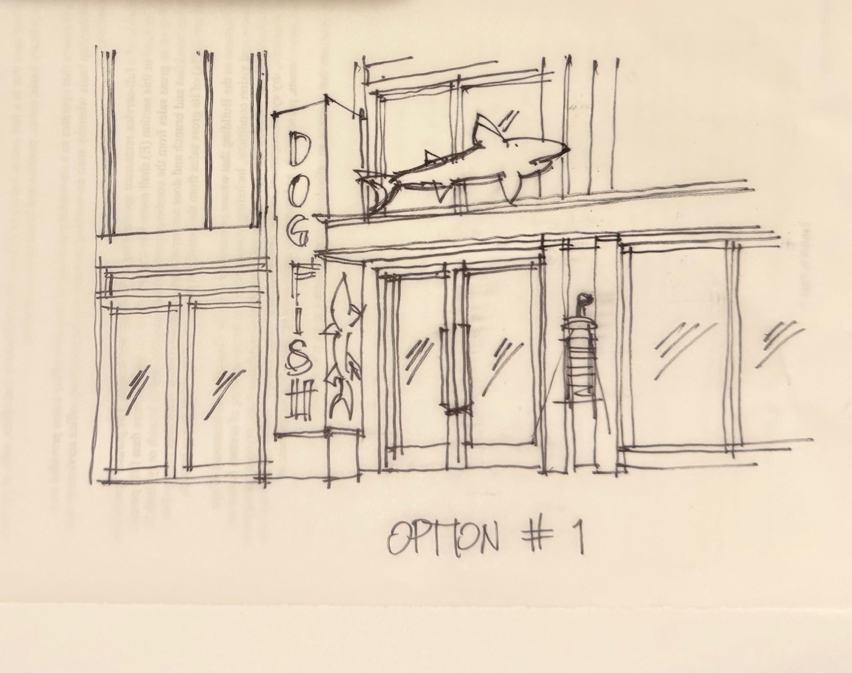 exterior shot render a vibrant urban storefront with a whimsical atmosphere the building fa ade features the bold sign dog fish in modern metallic silver letters above the door a large playful shark sculpture is mounted painted in glossy shades of ocean blue and white the surrounding building exterior is sleek with glass windows reflecting the city lights in warm golden hues the street is lively bathed in the soft glow of twilight casting long shadows and creating an inviting ambience the entire scene is alive with a sense of adventure and discovery