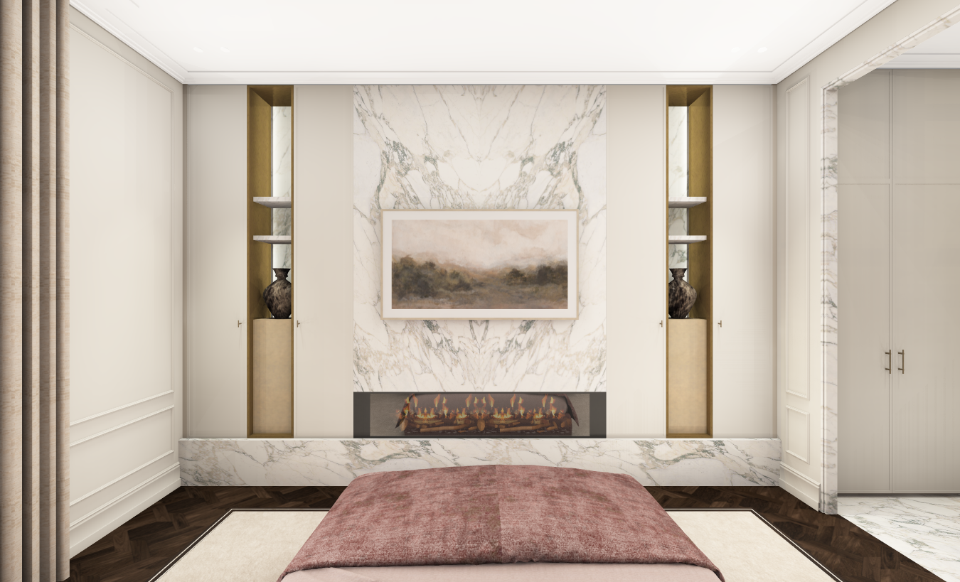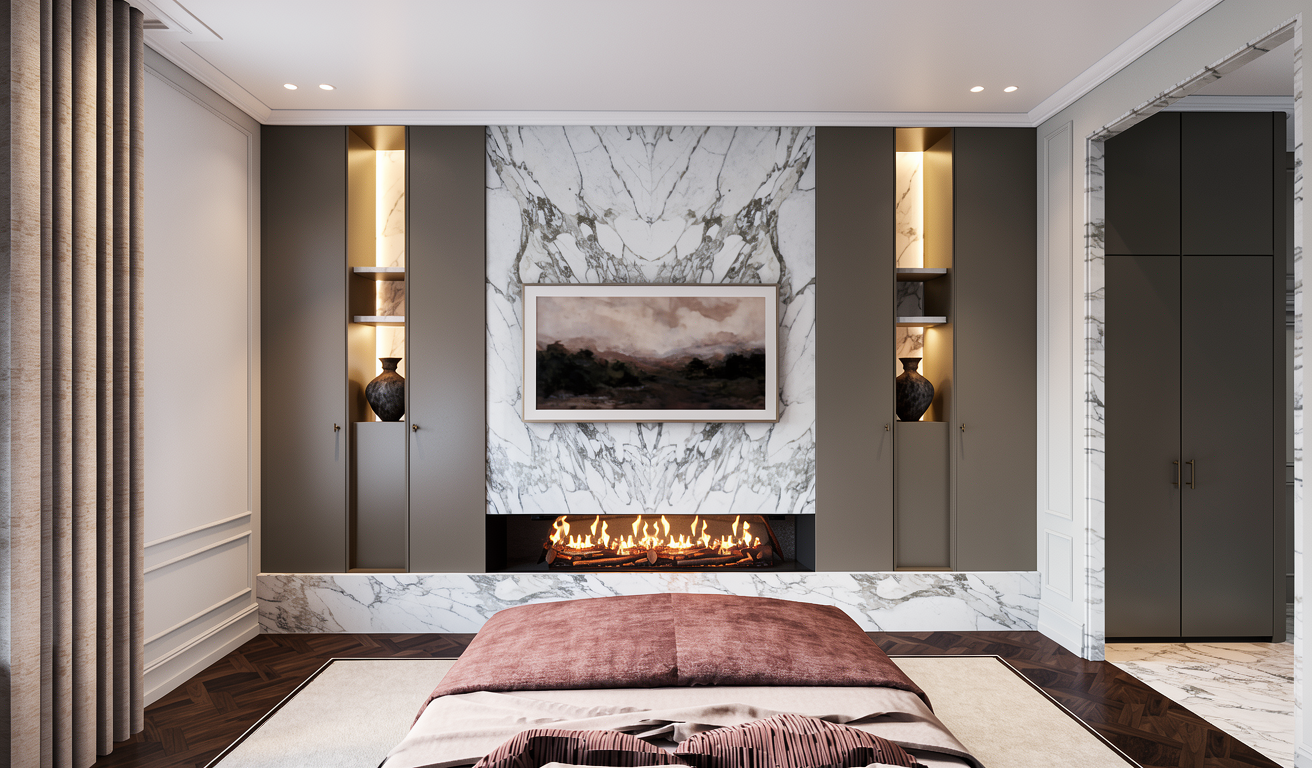 transform this image into an ultra realistic 3d photorealistic render preserve the exact original perspective camera angle proportions composition and geometry without any distortion or changes use physically accurate materials pbr with clean flawless surfaces no dust no scratches no damage no imperfections apply natural lighting with global illumination soft shadows and ambient occlusion use a professional full frame camera look with accurate focal length and balanced exposure ensure sharp high resolution output 8k quality with realistic but clean reflections and smooth surfaces maintain true to life colors and contrast no stylization no artistic interpretation strictly clean pristine photorealism add vertical lighting in the niches make the fire look realistic make the cabinets the same color as the walls