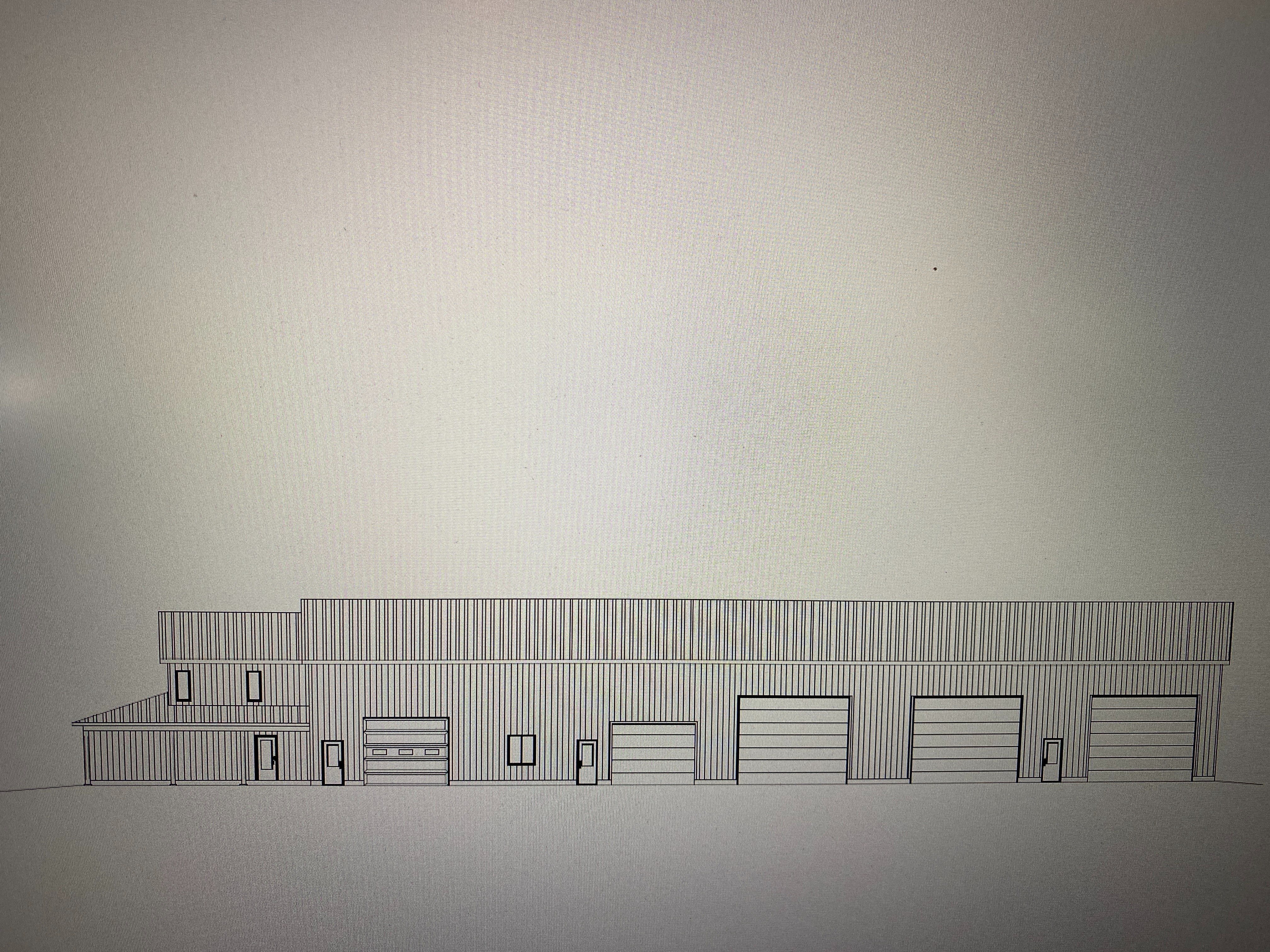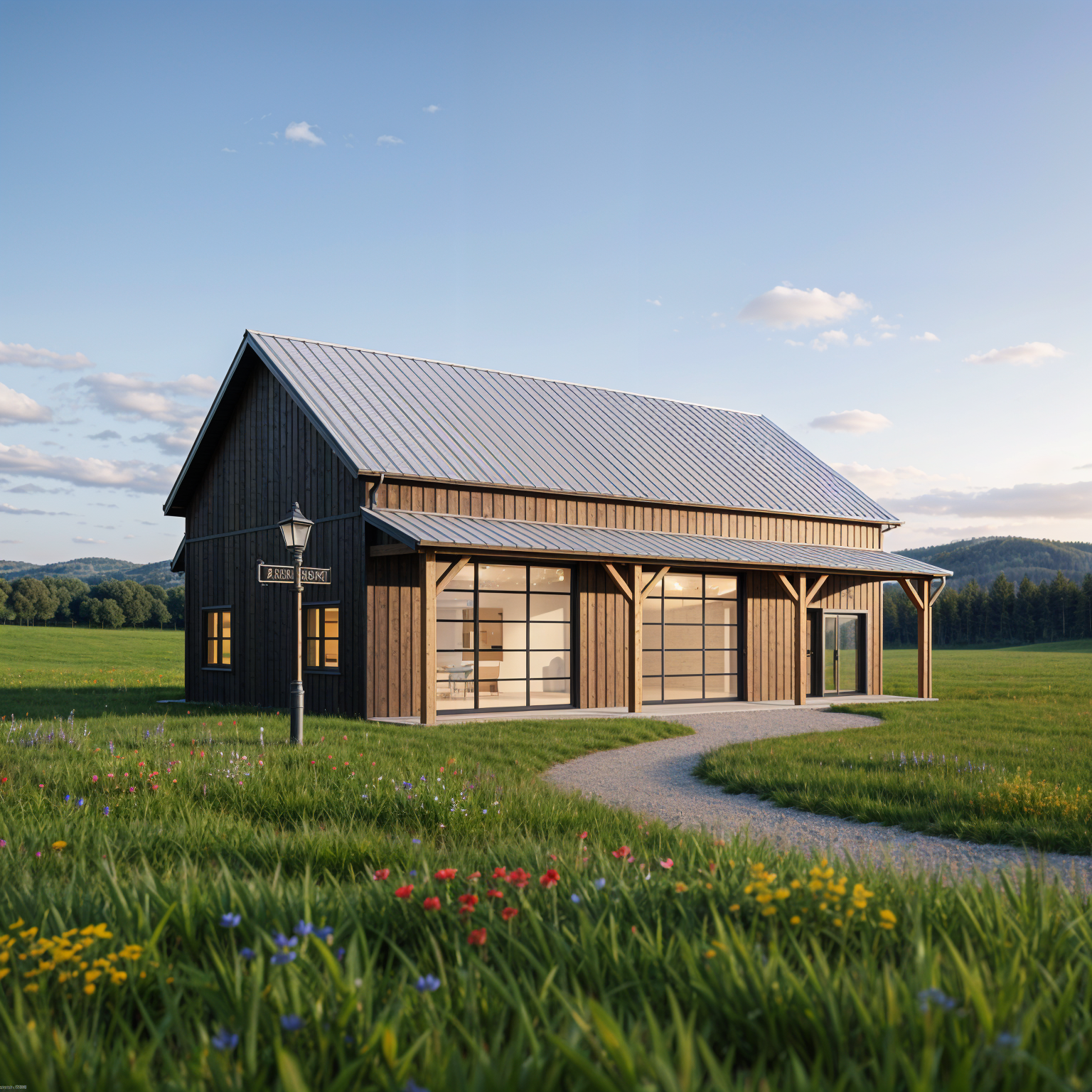 barndominium exterior shot create exterior rendering using charcoal steel siding grey steel roofing timber posts and polycarbonate overhead doors country setting architecture