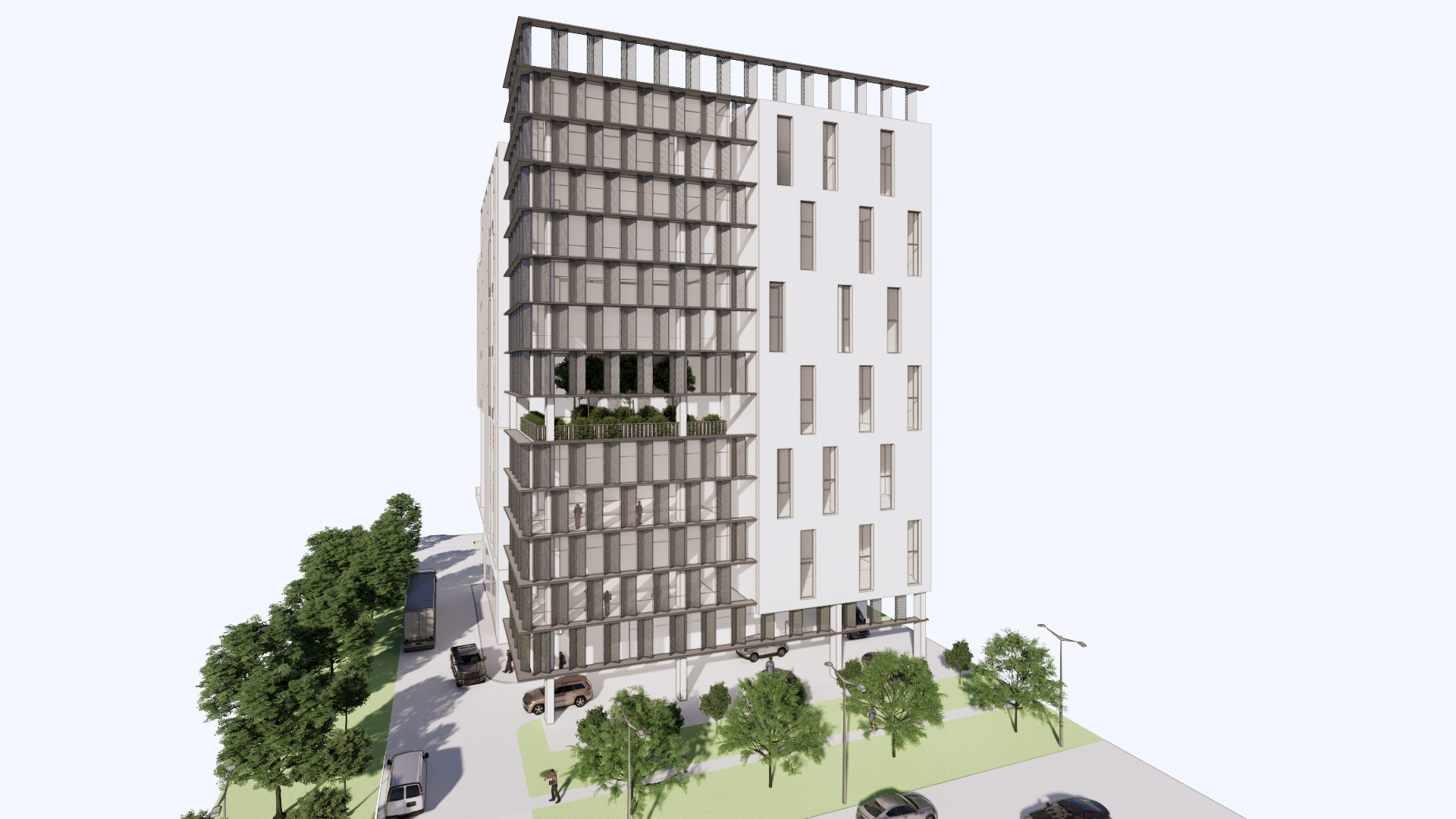 modernist exterior shot a modern high rise building with a white facade and glass insets surrounded by lush green trees the structure has a sleek contemporary design with grid like patterns over the glass use soft natural lighting to create an inviting atmosphere the trees are vibrant green the pathway is a light gray and the cars are a mix of black and silver the sky is a clear blue creating a fresh and clean ambiance architecture