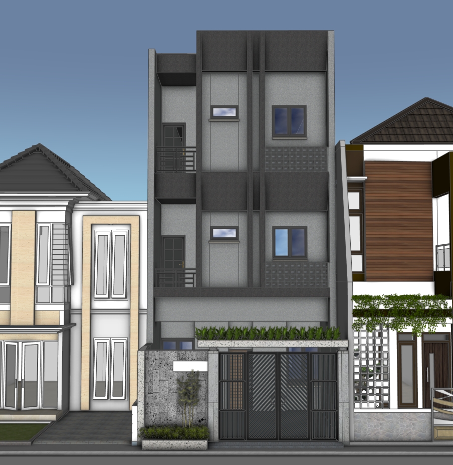 ultra realistic 3d render of a typical indonesian neighborhood in bright daylight narrow residential street small houses with tiled roofs warung on the corner motorbikes parked lush tropical plants clear separation between foreground elements motorbike potted plants street textures and background elements rows of houses distant trees blue sky high detail soft natural shadows photorealistic lighting 8k