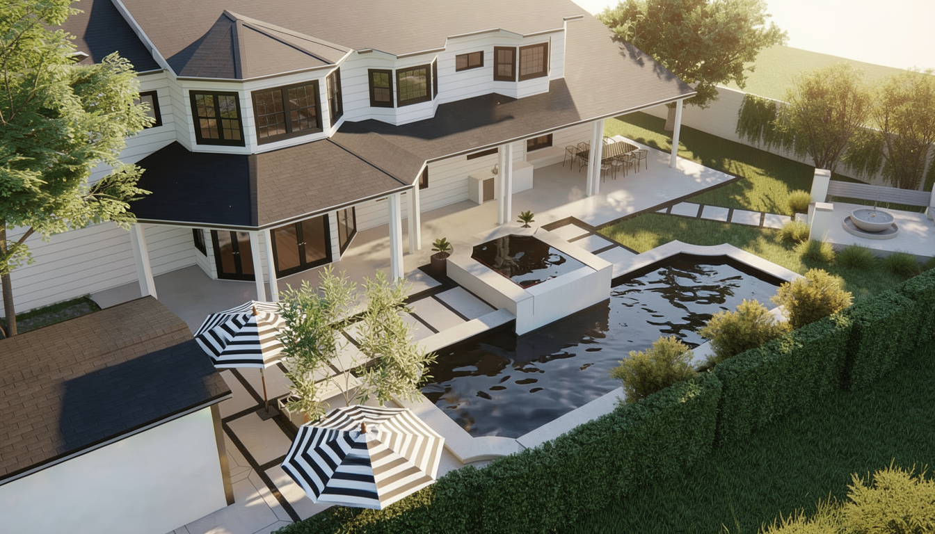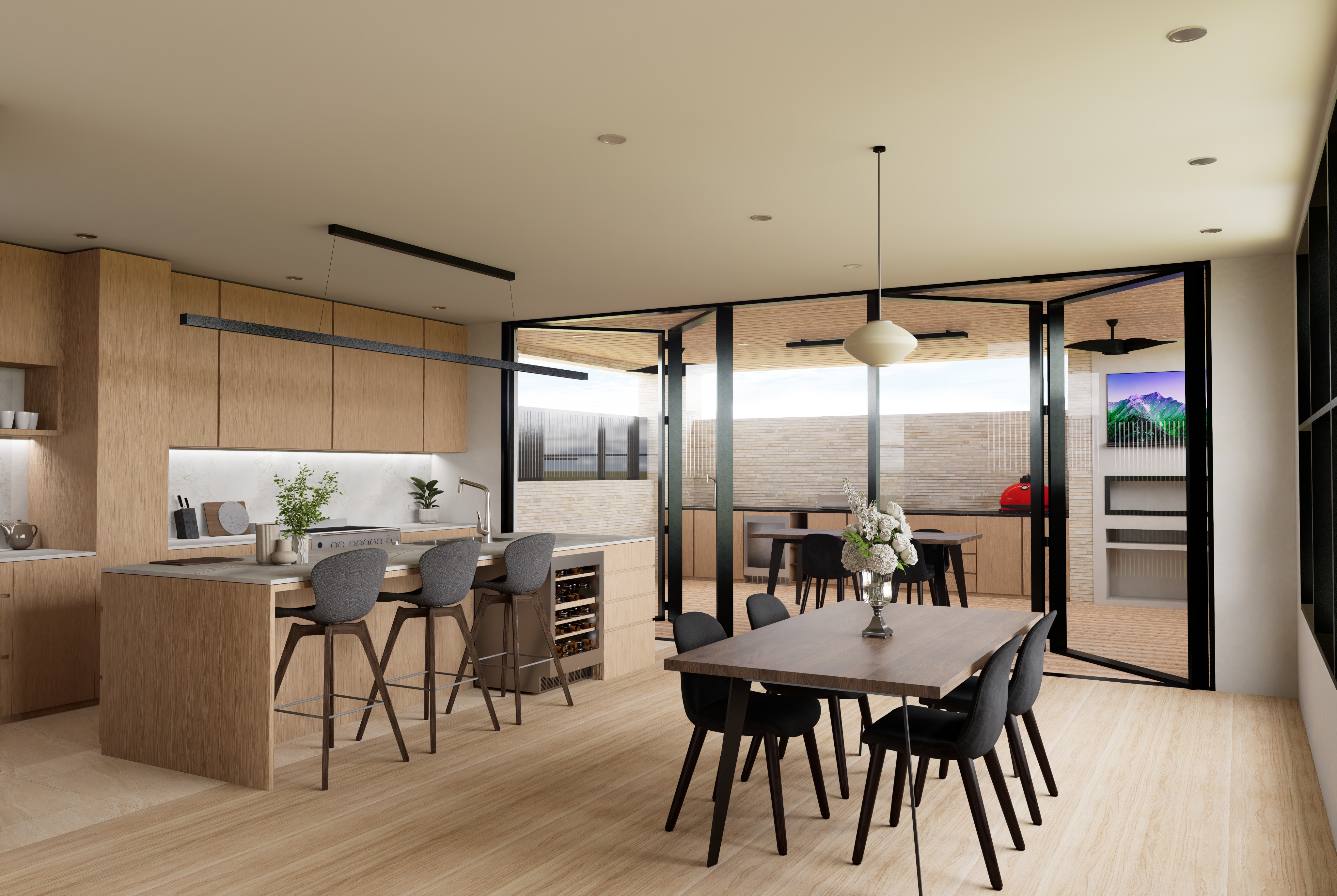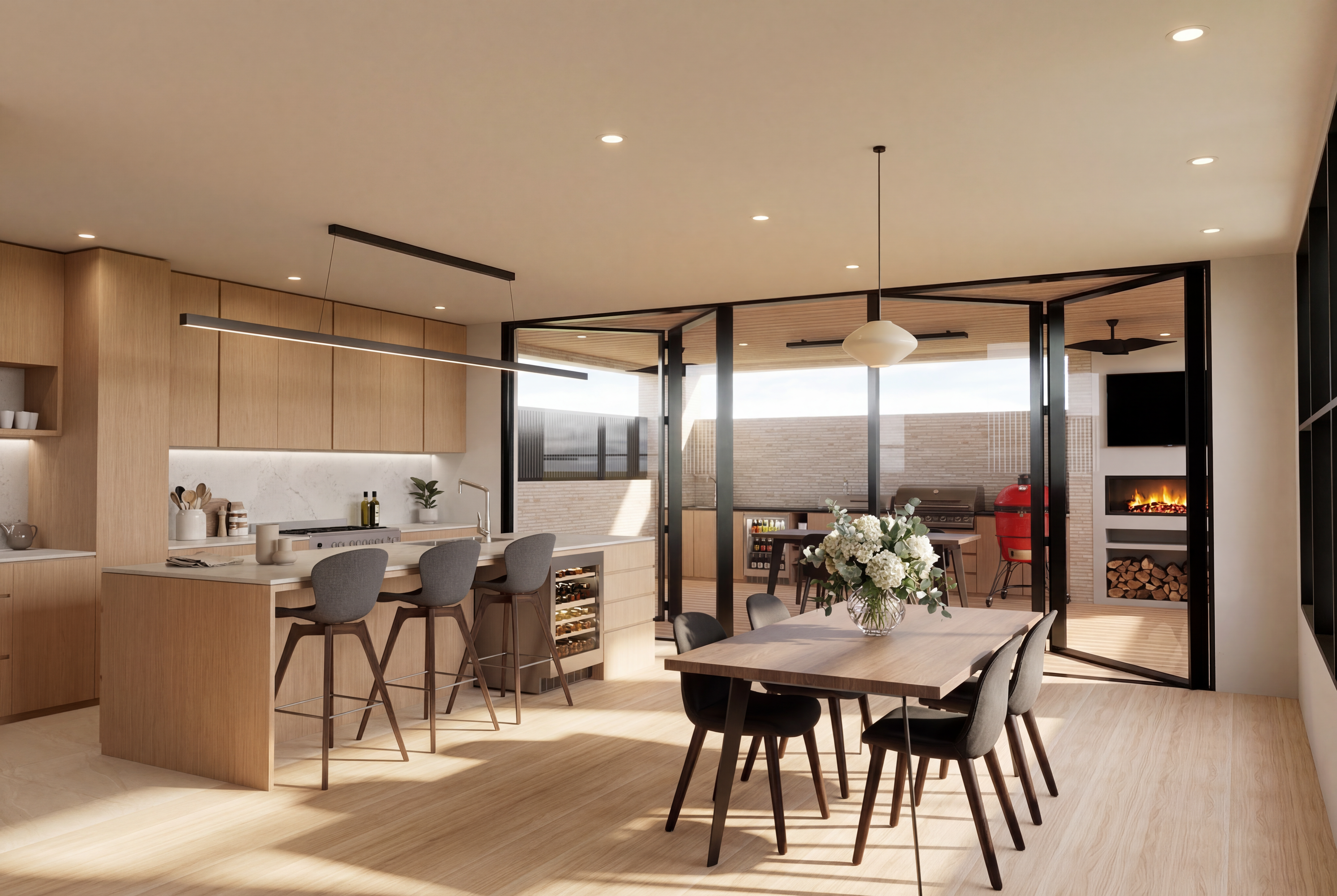 render this scene as a highly photorealistic image with maximum realism and accuracy maintain all existing geometry materials and design exactly as shown do not alter finishes only enhance their realism the kitchen cabinetry is polytec boston oak p o l y t e c boston oak ensure this material is accurately represented use strong natural daylight with realistic sun direction combined with soft warm ambient lighting from the downlights hanging strip light and pendant light all turned on subtly ensure the wine cooler under the kitchen island appears realistic with visible bottles and accurate reflections in the alfresco area the mini fridge should be filled with realistic drinks including bottles and cans render this scene as a highly photorealistic image with maximum realism and accuracy maintain all existing geometry layout and materials exactly as shown do not add remove or change elements only enhance their realism the kitchen cabinetry is polytec boston oak p o l y t e c boston oak ensure this material is accurately represented use strong natural daylight with realistic sun direction and soft shadows combined with subtle warm ambient lighting from the downlights hanging strip light and pendant light all turned on in the alfresco area fill the existing mini fridge with realistic drinks bottles and cans on the rear black benchtop use the existing inbuilt silver barbecue located behind the flowers do not add another barbecue next to it the red kamado joe smoker is inbuilt into the bench maintain its exact position and configuration do not make it freestanding in the back right corner show the tv turned off black screen below it render the electric fireplace turned on with a realistic flame the lower storage should contain natural stacked firewood logs maintain all materials exactly as per the original image and enhance them to appear lifelike add only subtle appropriate ornamentation that fits naturally within the scene ensure realistic lighting reflections shadows and overall composition throughout maintain all materials exactly as per the original image and enhance them to appear lifelike add subtle appropriate ornamentation such as kitchen accessories and styling elements that suit the space ensure realistic lighting reflections shadows and overall composition throughout