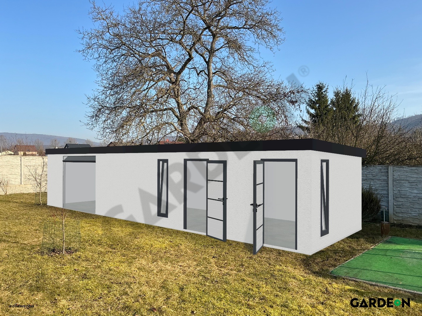 please make garage more real transform grass to better looking make tree with flowers and insice make shelters with garden equipment