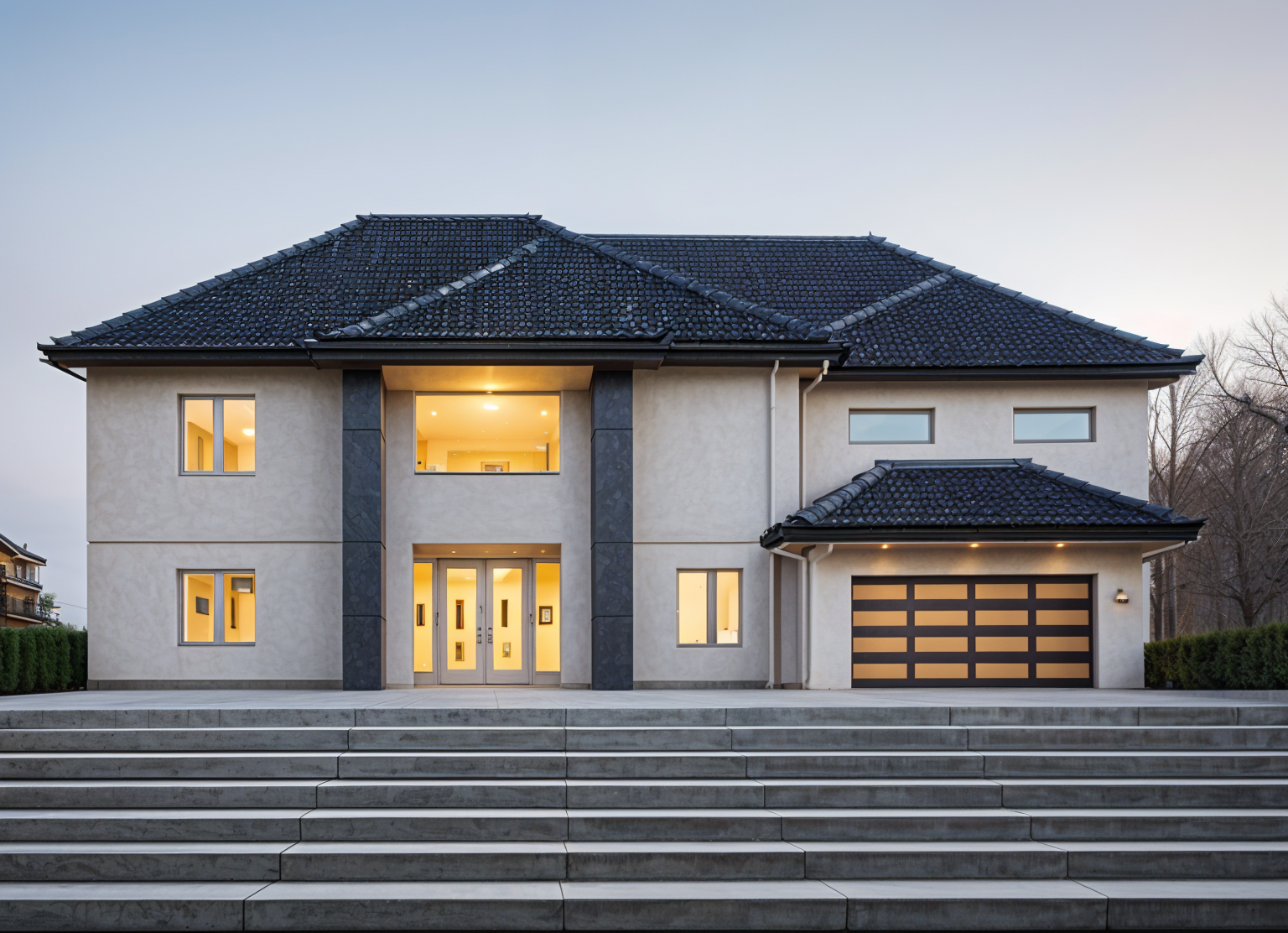 white brick house with black standing seam roof wooden deck with modern railings on the deck