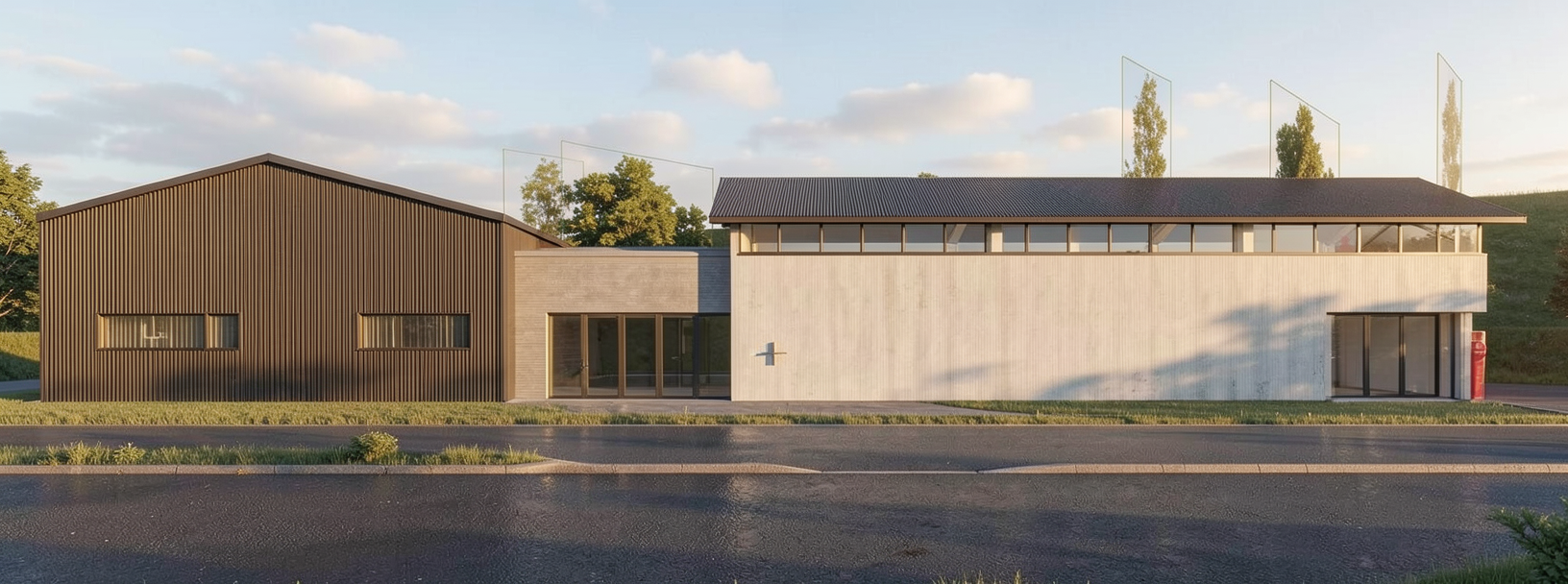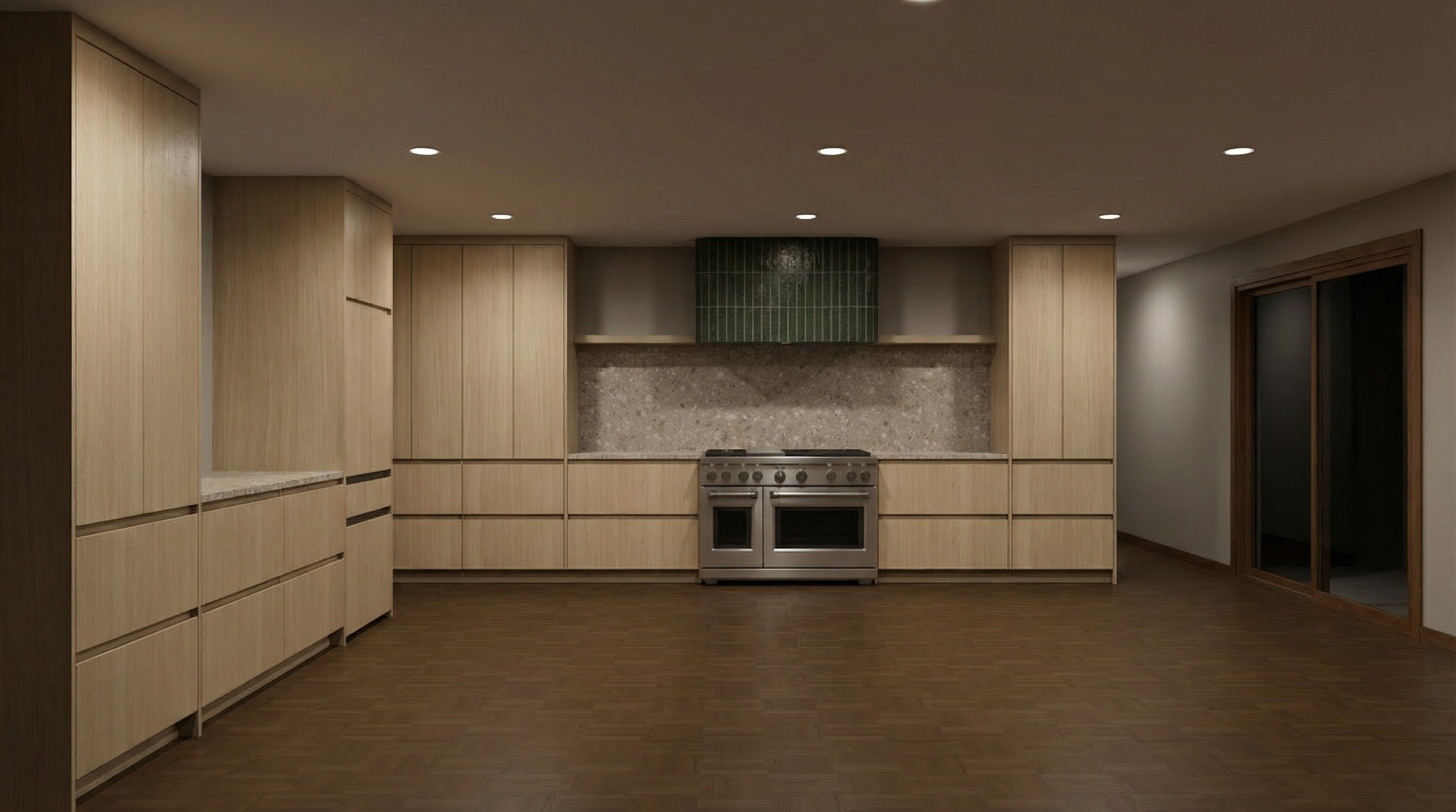 move the window on the left to the right replace the wooden floor with light colored terrazzo extend the tv cabinet to the left wall remove the corridor on the right and turn it into a corner wall make the tv bigger and shift it closer to the left corner add an 8 person dining table on the right side only one tv no pendants