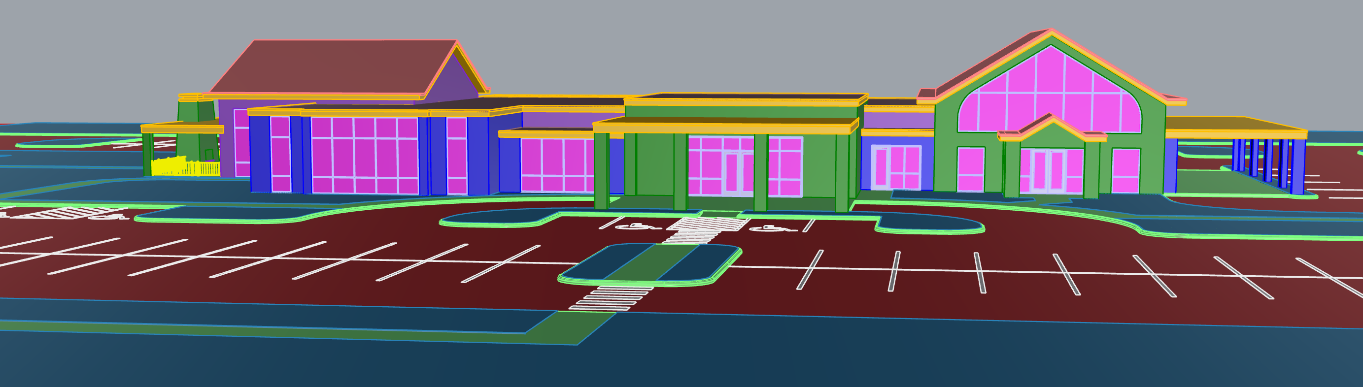 make a photorealistic render of the building above the royal blue should be vertical dark wood slats green should be limestone cladding pink should be reflective glass yellow should be a dark metal flashing purple should be cmu make photo realistic