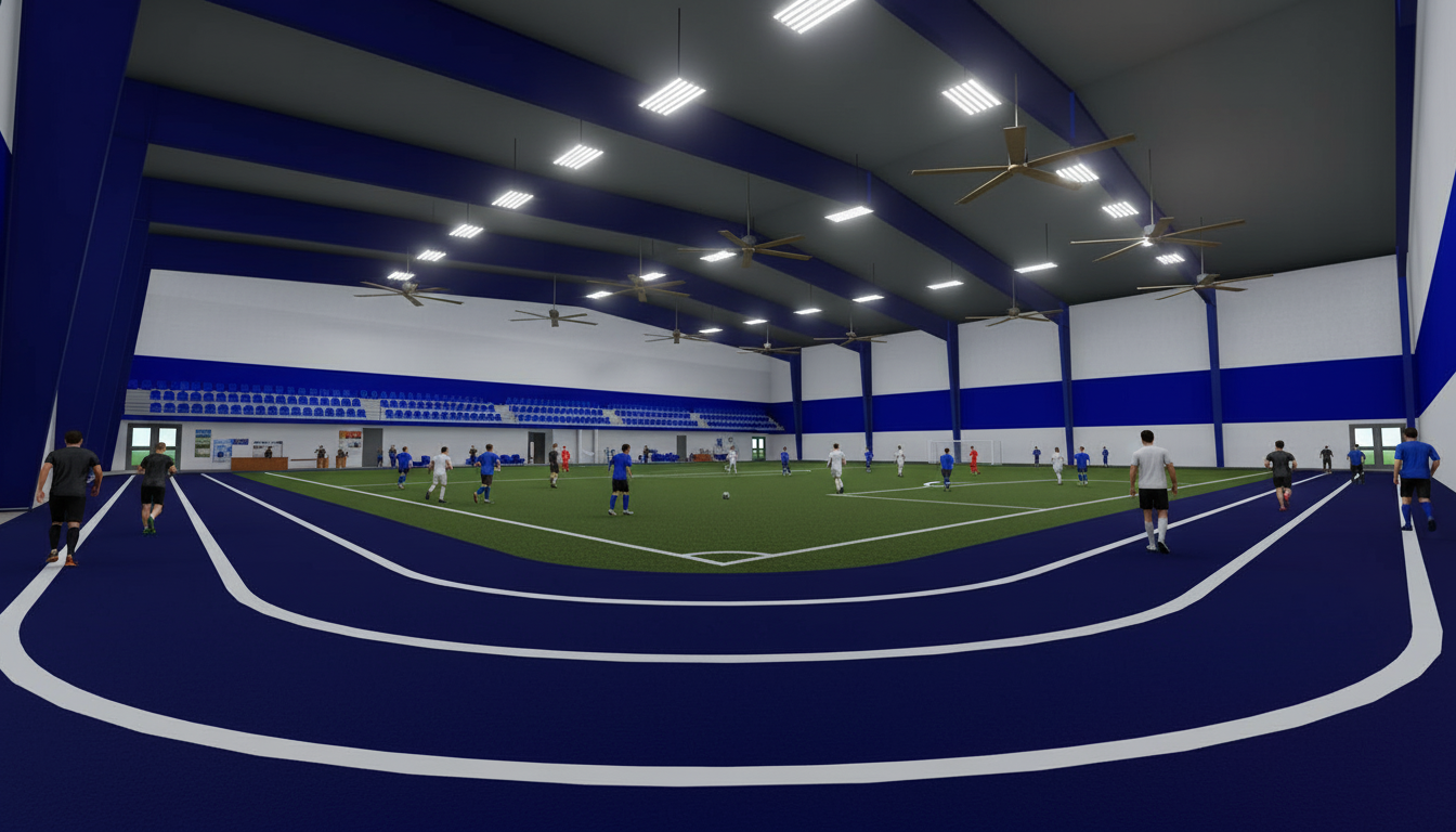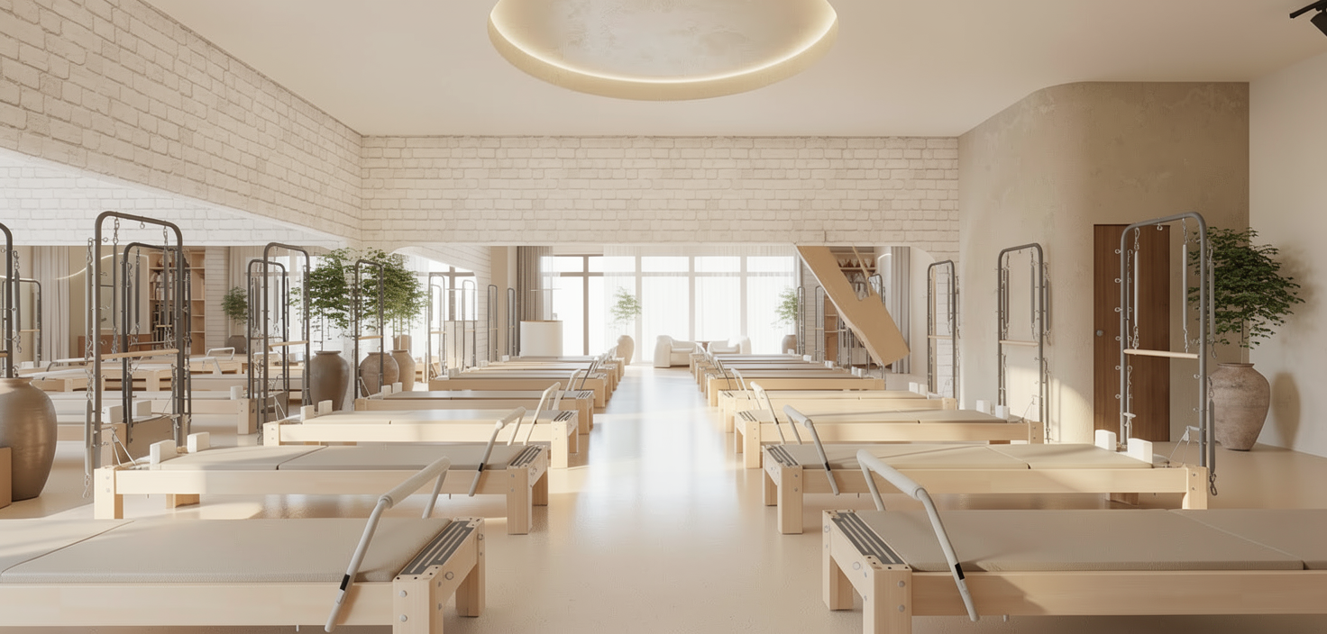 use the provided interior render as the base image keep the geometry camera angle and layout exactly the same long central axis aligned pilates reformers on both sides brick walls large circular ceiling light and the curved wall on the right maintain the existing color palette of warm neutrals light wood and soft beige transform it into a highly photorealistic image of a pilates and physiotherapy studio called fisio en forma with soft daylight coming from the large windows at the back subtle reflections on the floor and realistic textures on wood upholstery bricks and plaster do not change the number or position of the machines do not add or remove furniture or decorations only enhance realism lighting shadows and fine details for a premium wellness interior
