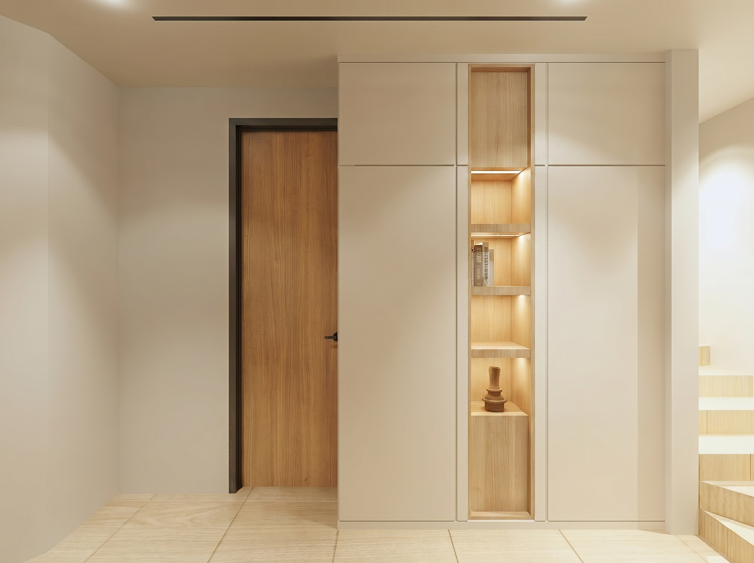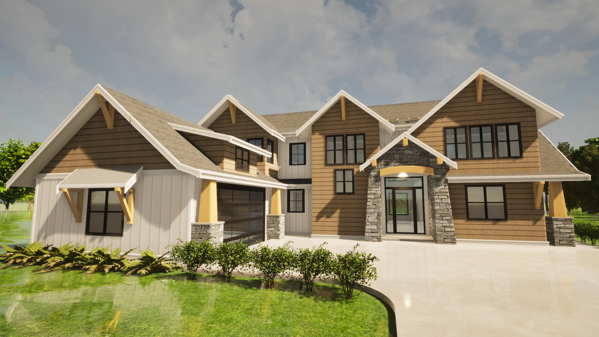 render this image at dusk with interior lighting the brown siding will be cedar shakes with a natural stain make no changes to design