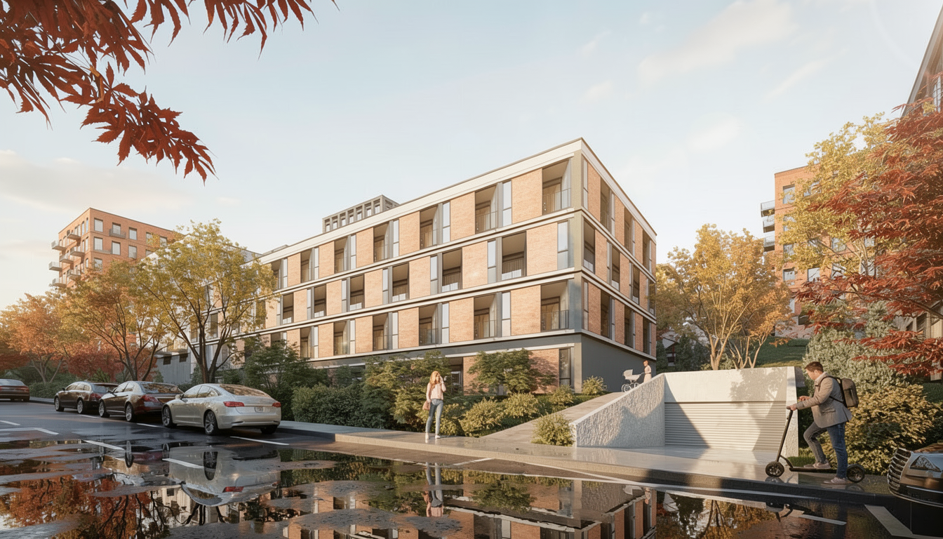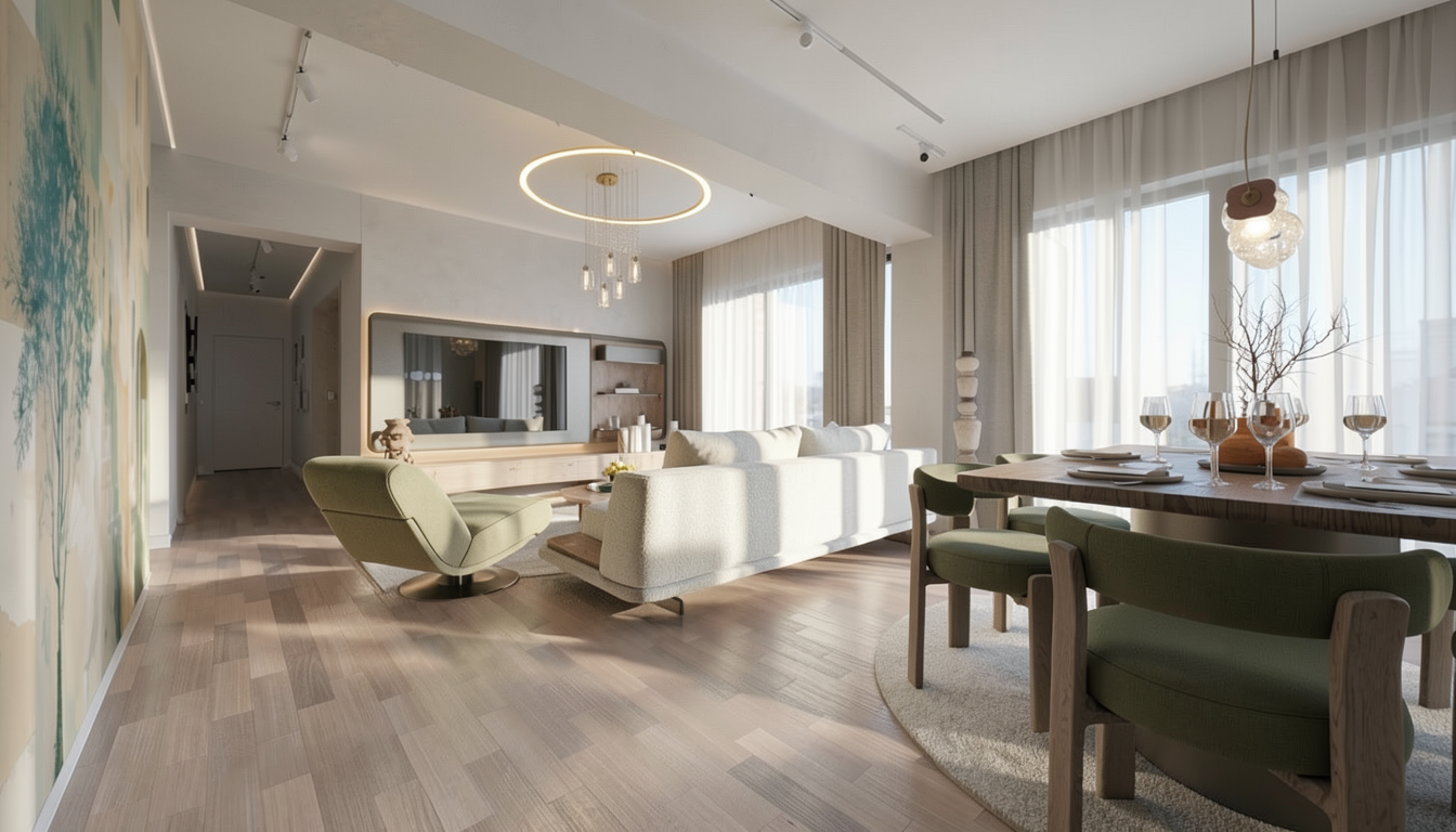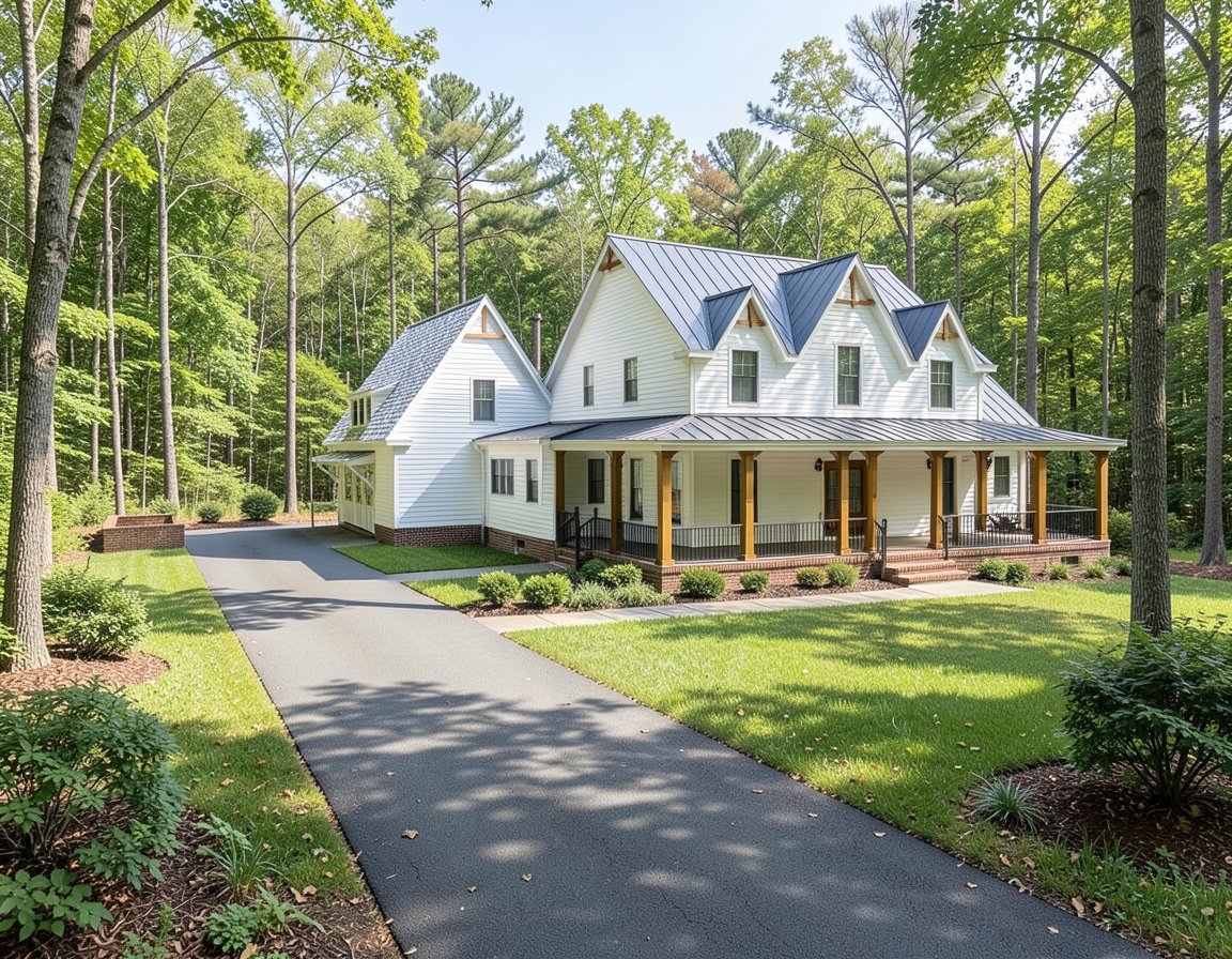make as photorealistic as possible while keeping textures the same as selection professional landscaping in a lightly wooded scene with good lighting sw pure white siding silver birch shingle roof on main roof slate gray metal roofing on porch roof key west brick asphalt driveway with sidewalk leading to front porch