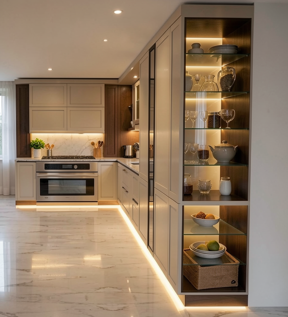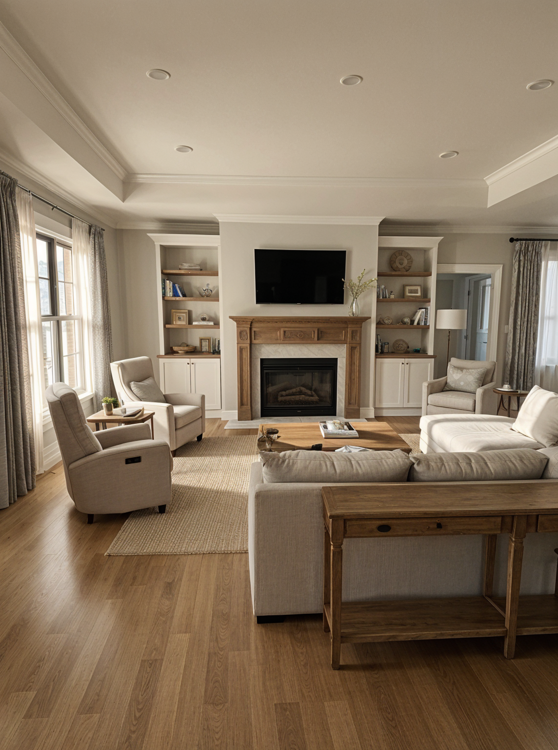 crop out the stove and gas pipes on the left side crop out the drop cloths on the fireplace in the back of the room add stained wood shelving to the open areas paint the unpainted areas white on the cabinets stain the mantle with the same color as the shelving add furniture in the room a couch in a light fabric along with a love seat in light fabric two recliners that are modern and a coffee table and neutral colored rug sofa table behind the larger couch add minimal accessories and do the rendering in a transitional style add double rod full height curtains to the windows with a sheer underneath and a neutral print on the outer curtain change the marble on the fireplace to wood painted trim add a tv above the mantle a neutral upholstered chair in the corner by the window and shelves a loveseat on the left in front of the window the bigger couch on the right side where the two recliners are and keep the same recliners but put them facing the fireplace using the same furniture style now use a sectional sofa on the right side of the living room and facing the fireplace and put the same two recliner type chairs in front of the window with one facing the tv and one in the corner by the shelves with a table in between for the open shelving the shelves should be stained but the rest of it should be painted white turn the sectional the other way with the long side facing the fireplace and the short side with chaise on the right side keep the sofa table behind the long side facing the fireplace now keep the furniture the same and everything else the same except change the fireplace surround back to a stained plain mantel with a white painted plain trim around the actual fireplace remove the extra upholstered chair on the right side and move the sectional closer to the fireplace