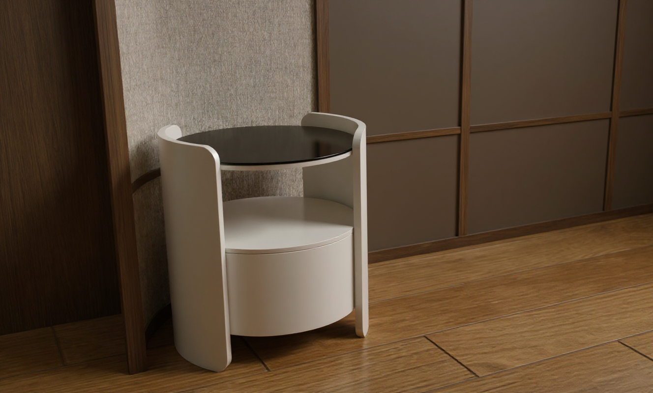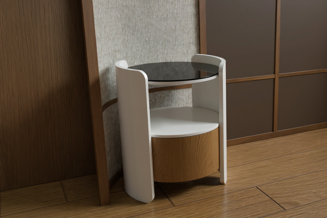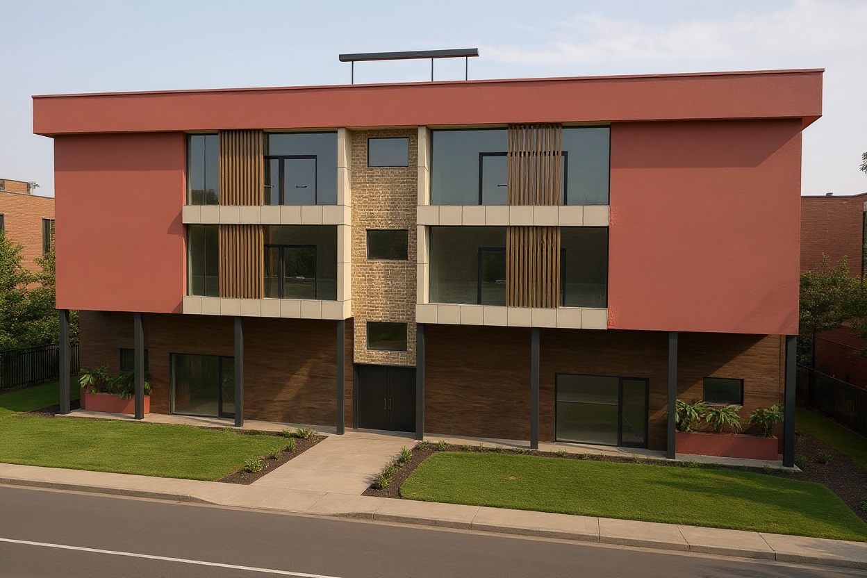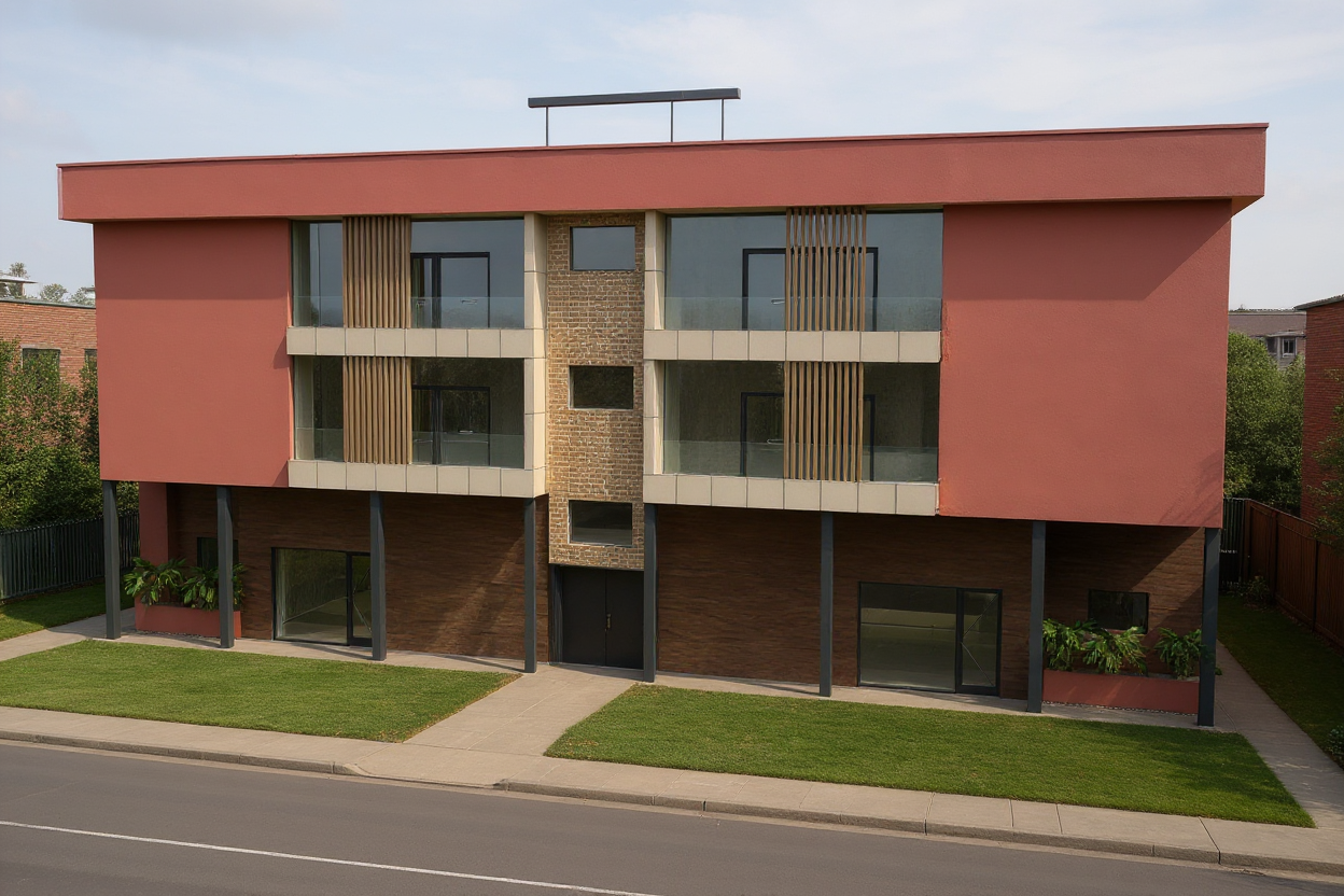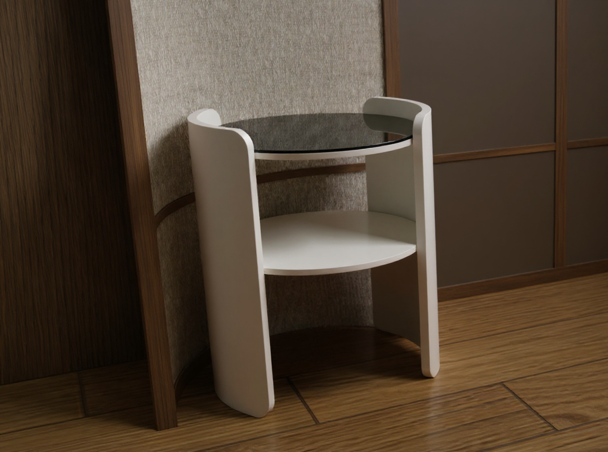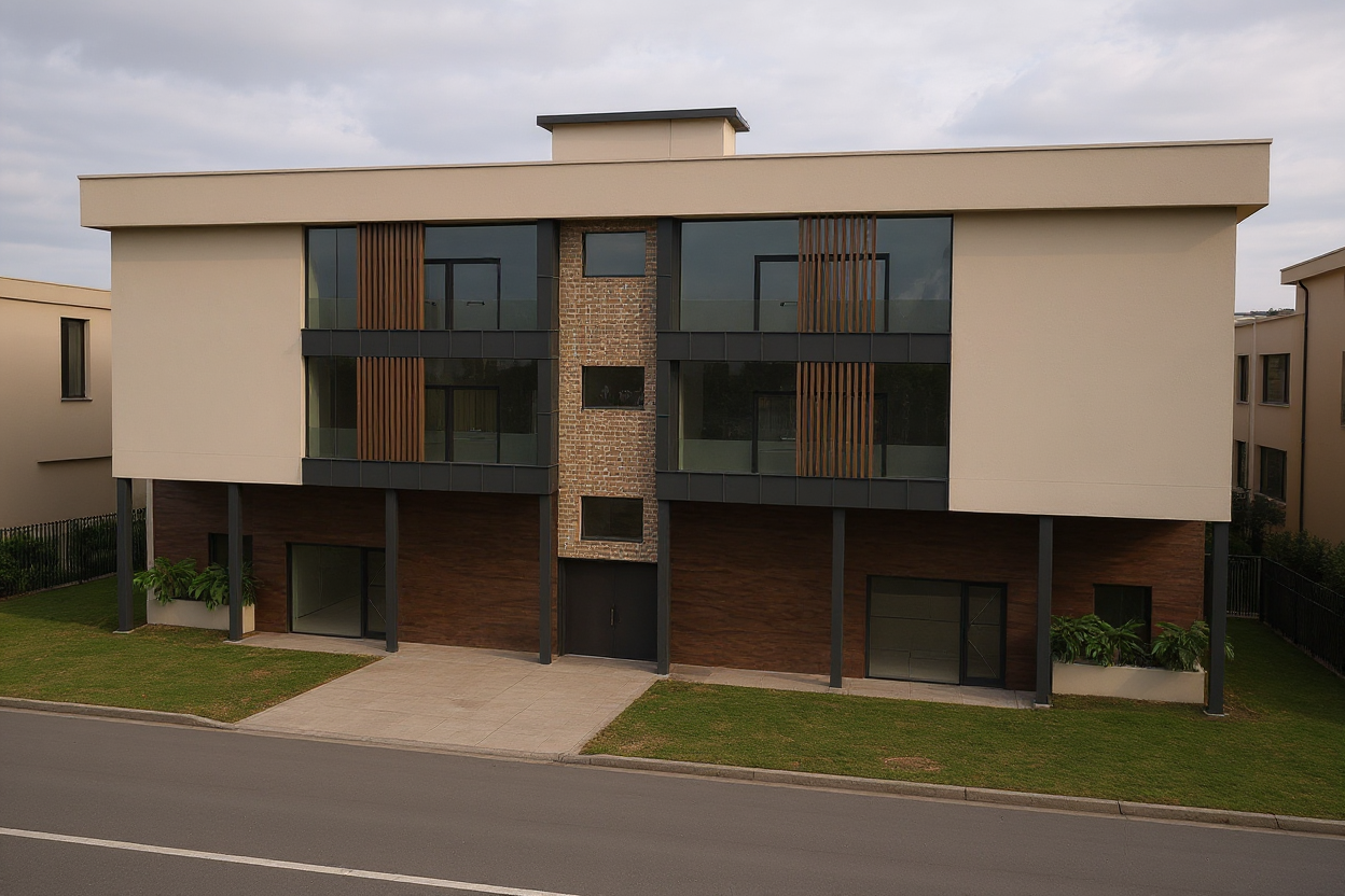 a modern cafe interior with a minimalist design a sleek marble counter in a soft gray hue with subtle veining complemented by bar stools in a muted taupe color cozy armchairs in a warm earthy brown are arranged around circular white tables with wooden bases the dining area features elegant chairs in a light brown fabric paired with matching white top tables the atmosphere is calm and inviting with soft ambient lighting creating a comfortable relaxed space