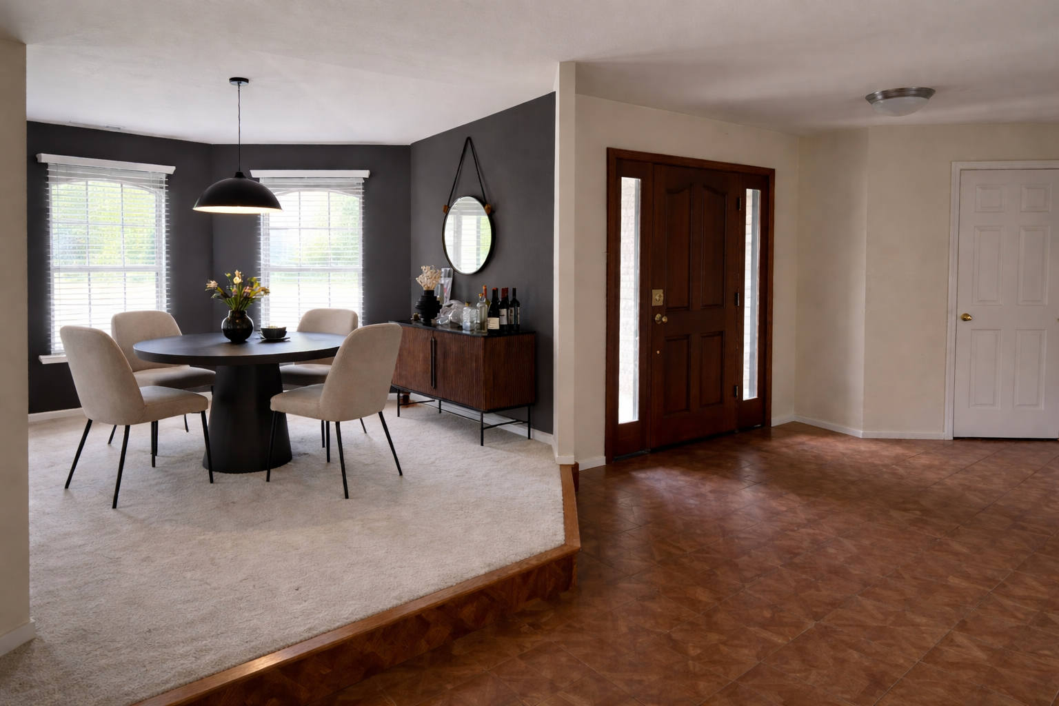 add new flooring throughout laminate floors not to dark not to light white oak looking flooring paint front door black paint beige walls white to match ceiling