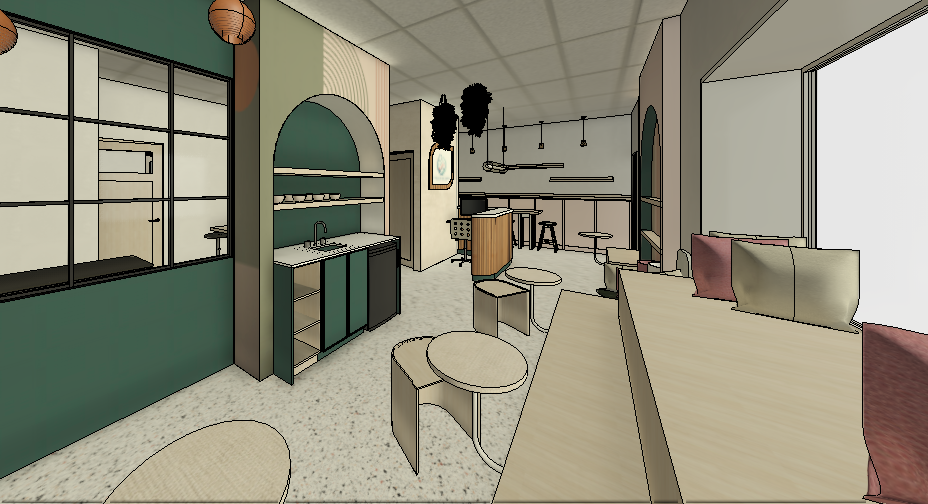 absolument c est un point crucial pour s assurer que l ia ne r organise pas l espace de mani re al atoire lors du rendu voici le prompt final pour archsynth en insistant sur la disposition fixe des l ments tout en conservant le focus sur les textures de bois profil et la peinture la chaux sans mention de couleurs prompt pour archsynth texte copier coller interior design photograph of a modern medical clinic interior with a fixed and precisely arranged layout designed with a comforting yet joyful and inviting trendy caf aesthetic the atmosphere feels optimistic utilizing a cohesive selection of natural textures and abundant daylight it is imperative that all specific spatial elements remain exactly in their designated locations the main reception desk backed by a feature wall finished in tactile textured lime wash paint peinture la chaux and wrapped in light wood tambour slatted wood profile is positioned at the entry the adjacent primary waiting area features a raised platform estrade made of light wood integrated permanently alongside a large floor to ceiling window overlooking a peaceful courtyard the platform is adorned with comfortable plush bench seating and soft textured cushions nearby several small minimalist light wood work tables with stylish chairs made of bentwood profiles offer charging stations a dedicated children s corner is fixed nearby marked by a distinctive green artificial grass texture rug filled with simple tactile wooden toys and a large abstract mural focused on organic textures separated by a partial glass and wood slat screen is the staff break room and kitchenette this area includes a sleek light wood kitchenette with white cabinetry and open shelves a large communal lunch table made of pale solid wood and an integrated well stocked library bookshelf unit built directly into the wall adjacent to the lunch table the overall space uses natural textures soft diffused lighting and plenty of large lush potted plants the main floor is smooth light polished concrete high resolution realistic render architectural photography style natural daylighting intimate and welcoming composition