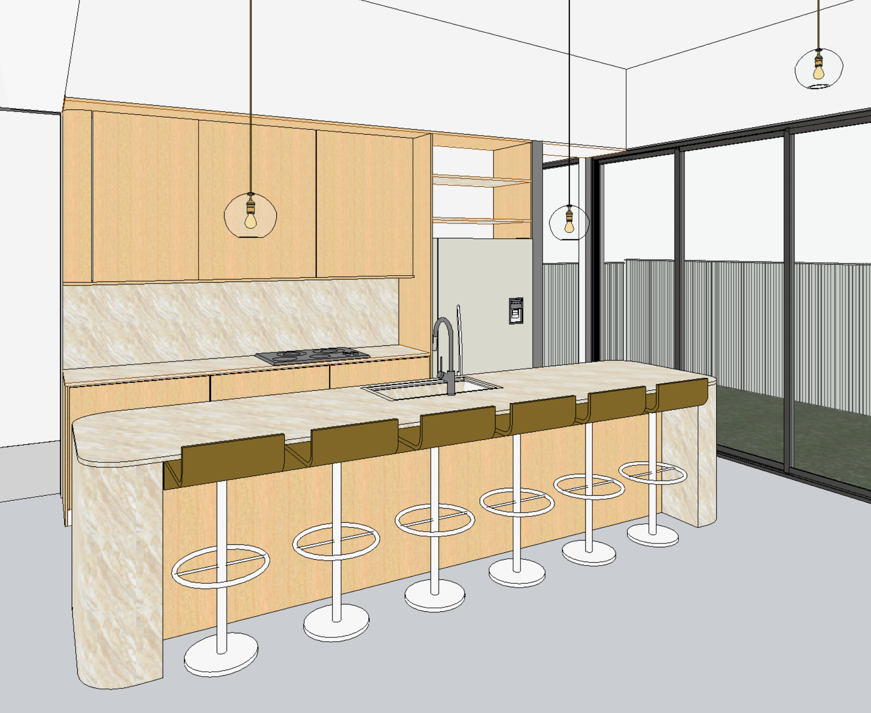 modern mediterranean kitchen interior with pale oak cabinetry doors the countertops is a champagne stone benchtop adding a luxurious touch the splashback on the wall behind the kitchen to be the same stone as the bench soft ambient lighting from spherical pendant lamps creates a warm and inviting atmosphere the walls are a natural white with subtle texture enhancing the contemporary feel the floor is a smooth concrete with beige and grey veins to add depth the overall mood is cozy yet sophisticated blending minimalism with mediterranean design brushed rose gold light fitting neutral tones calming atmosphere modern serene ambiance realistic 8k render