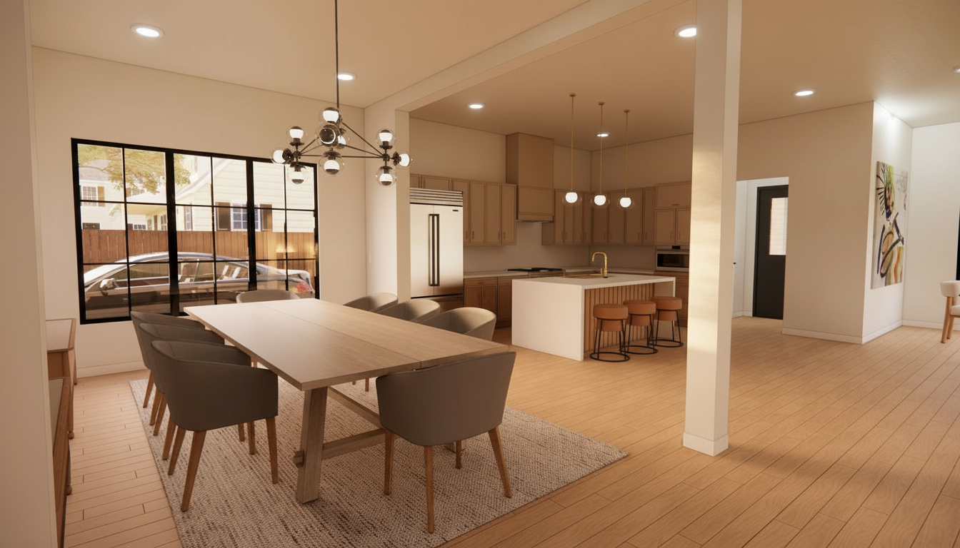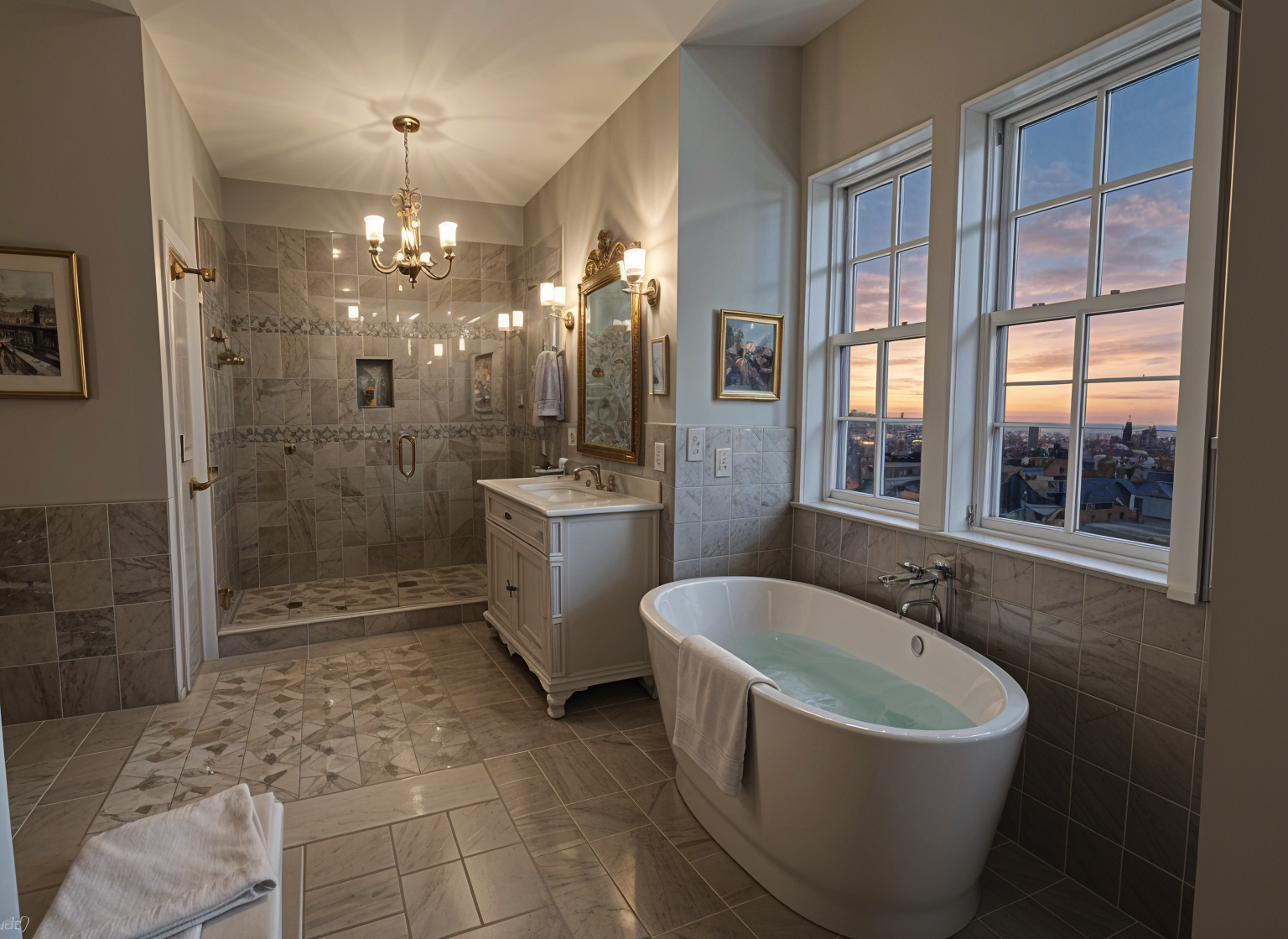 realistic image move chandelier centered on windows remove tile from wall on the left side add small fluffy white rug in front of bathtub add white window shades at windows change view outside windows to low dusk sky make floor and shower tile less busy remove chandelier remove chandelier remove windows in shower
