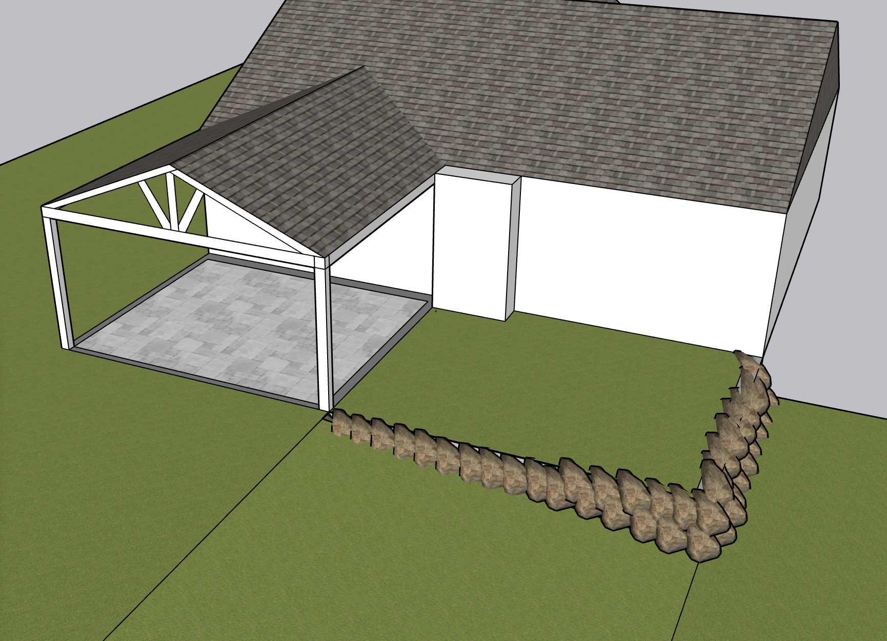 make the pavers unilock treo granite fusion with a charcoal paver border and the rock in the image is a boulder wall also make the pavillion look finished