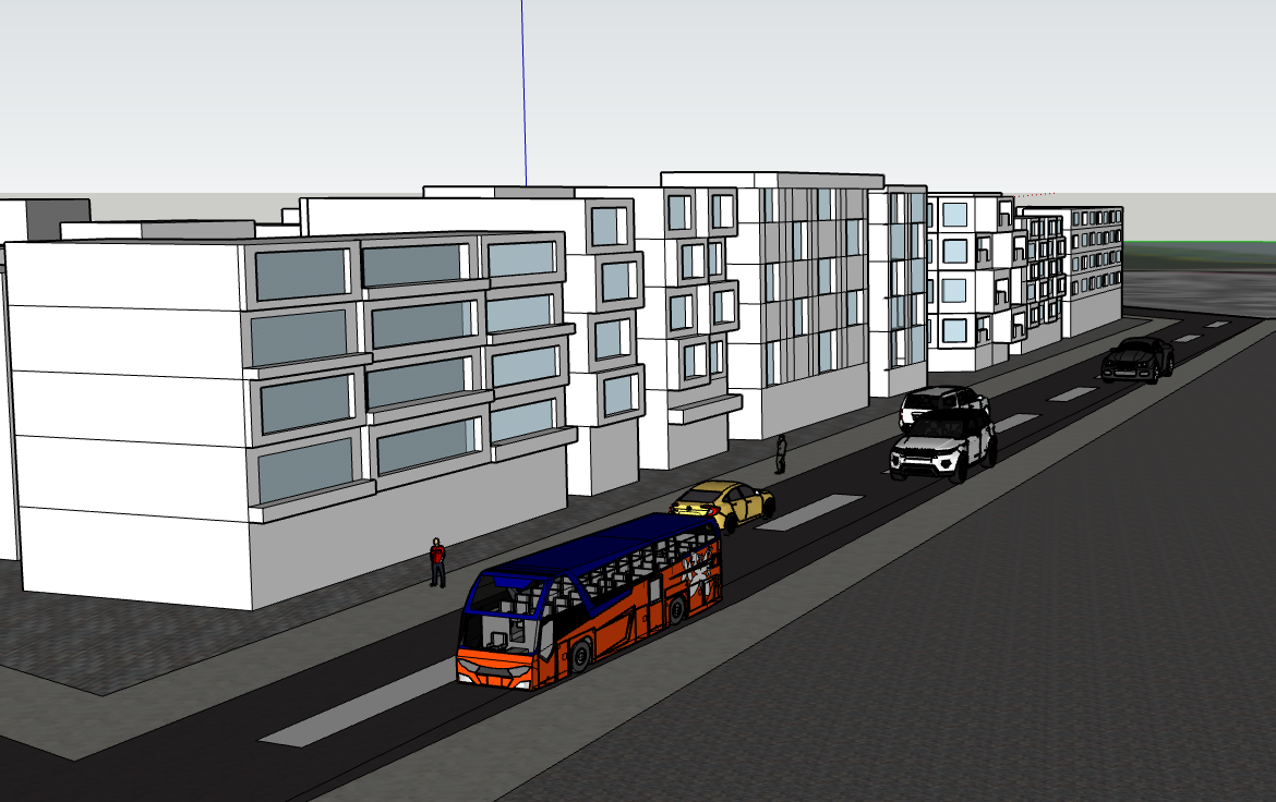 urban landscape with modern architecture featuring a cluster of sleek white geometric buildings the structures rise against a clear blue sky casting long soft shadows on the surrounding streets streets are paved in smooth gray asphalt with clean white lines marking the lanes sidewalks are a light sandy beige providing a natural contrast the atmosphere is serene and futuristic with a gentle warm glow from the setting sun casting an amber hue over the scene the road is one lane way