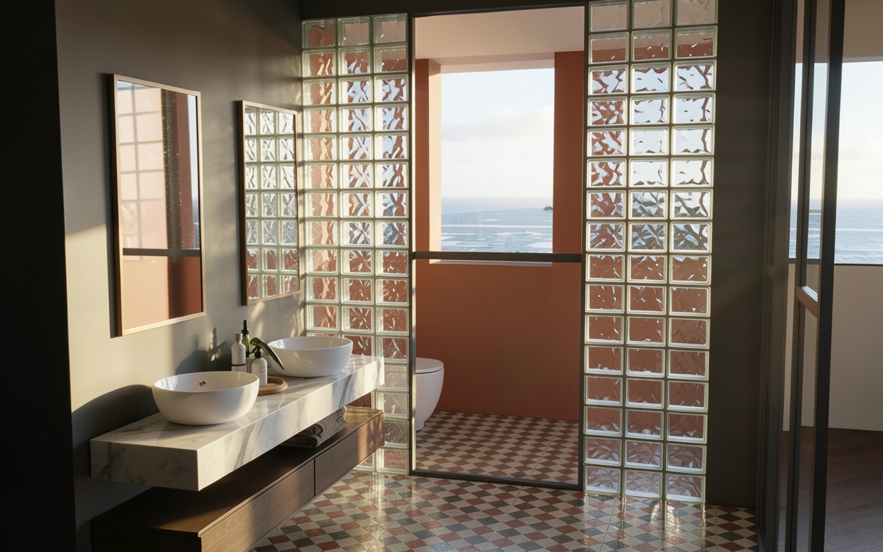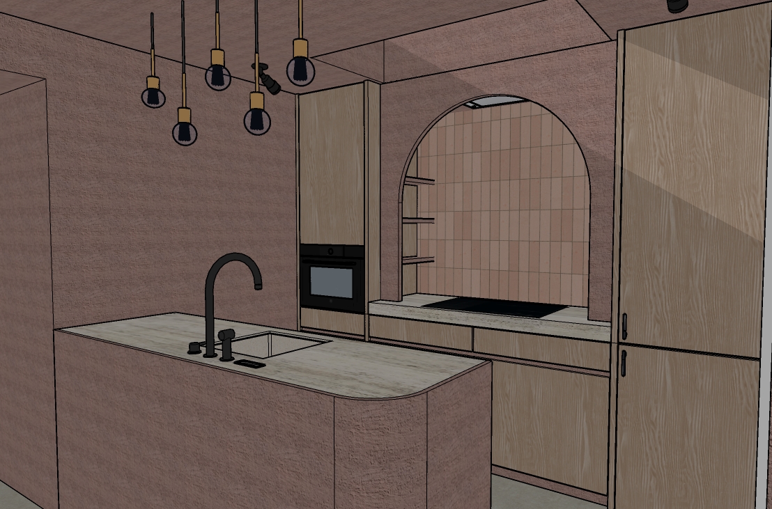 add lighting make photorealistic side of the island is in same material as the walls make venetian plaster nicer