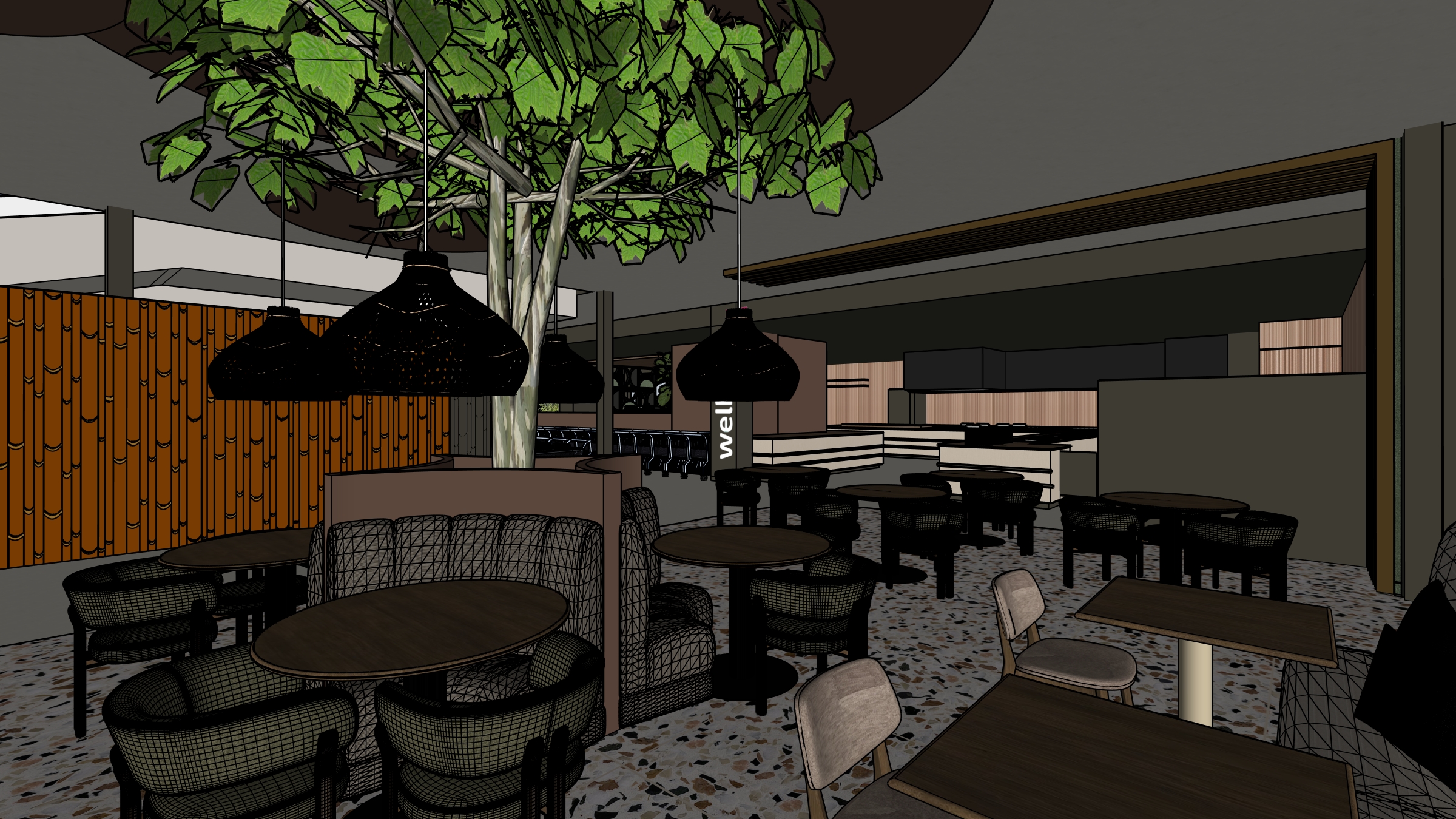 a photorealistic 8k high resolution interior photograph of a modern hospitality and cafe space looking across a dining area towards a large central tree based strictly on the perspective and composition of image 2 png the scene is illuminated by sophisticated layered architectural lighting that creates complex shadows and highlights emphasizing the textures there are absolutely no changes allowed to the design placement or proportions of the original image flooring the central floor features a detailed patterned terrazzo surface with black white brown and pink stone fragments embedded in a pale creamy matrix the surrounding floor areas are a smooth polished concrete in a subtle gray beige tone columns and structure the central column supporting the tree and surrounding furniture and other structural columns are finished in a smooth matte coat of complex dark charcoal green paint little greene attic 2 pergola structures and suspended rod elements feature a warm bronze finish walls and ceilings main ceilings raw textured gray concrete stucco floating ceiling discs above tree large suspended circular panels finished in a textured felt in little greene attic 2 dark charcoal green bamboo pattern wall left highly textured wall panel featuring an intricate geometric bamboo style layered felt pattern by tacktile with a caramel base layer visible beneath a date top layer kitchen back wall background covered in highly textured vescom tonga 1082 12 wallcovering furniture and seating zones central feature a large mature multi trunk ficus tree with large vibrant green leaves is centered the surrounding circular furniture base is finished in matte paint little greene attic 2 half round booths central upholstered in highly textured complex dark liquorice colored fabric verotex tobago saba 05 liquorice rounded chairs with armrests feature a donkergroene stof upholstery on a walnoot hout base armless chairs far background left feature a smooth neutral taupe wool felt fabric canyon 0967 0025 taupe surrounding a walnut topped table on a warm beige pedestal right foreground tables and chairs feature simple armless chairs with light textured seats on dark metal legs and walnut topped tables on light pedestals kitchen service counter area background linear textured pale wood grain laminate comparable to decolegno reflex fd06 with precise dark charcoal green painted edges countertop is smooth polished white quartz with subtle soft grey veining comparable to quartzform veined deco 915 linear bronze slat details over the kitchen lighting the central feature tree and seating is illuminated by large intricate handwoven tear drop shaped rattan pendant lamps in their naturel kleur warm natural rattan tone additional warm architectural spotlights are integrated throughout signs a prominent vertical sign on a dark column reads well in vertical white lowercase text with a pink and magenta logo above it plants the central focus is the ficus tree refinement focus on photorealistic details texture definition for all materials felt leather fabric concrete rattan stone accurate light behavior and realistic reflections maintain the exact spatial arrangement strict directive render the scene exactly as shown preserving all proportions and design elements but with photorealistic materiality and lighting do not add or subtract elements