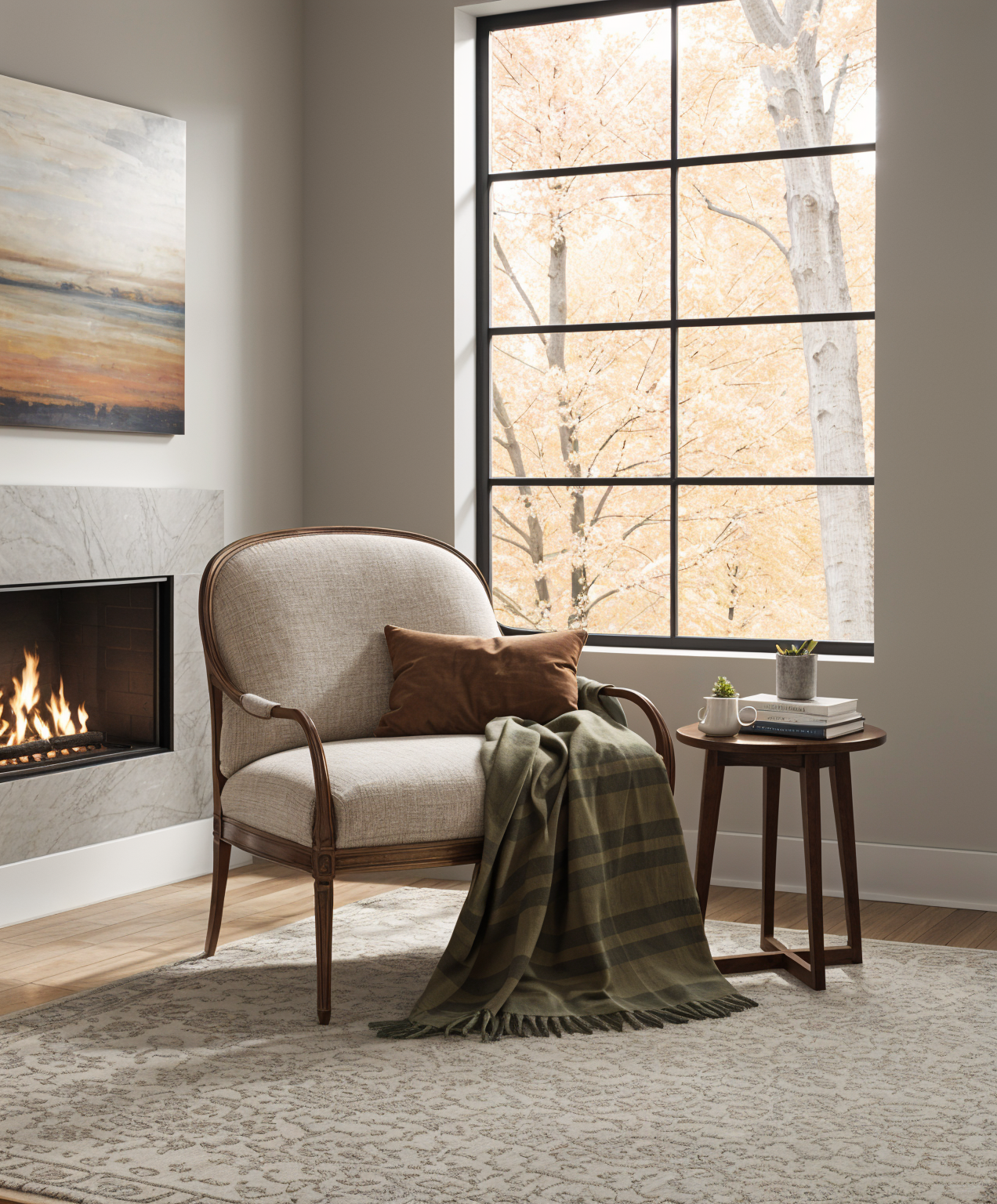 use the exact items to create a cozy reading corner for autumn the room should be showing the corner with some windows the style should be contemporary