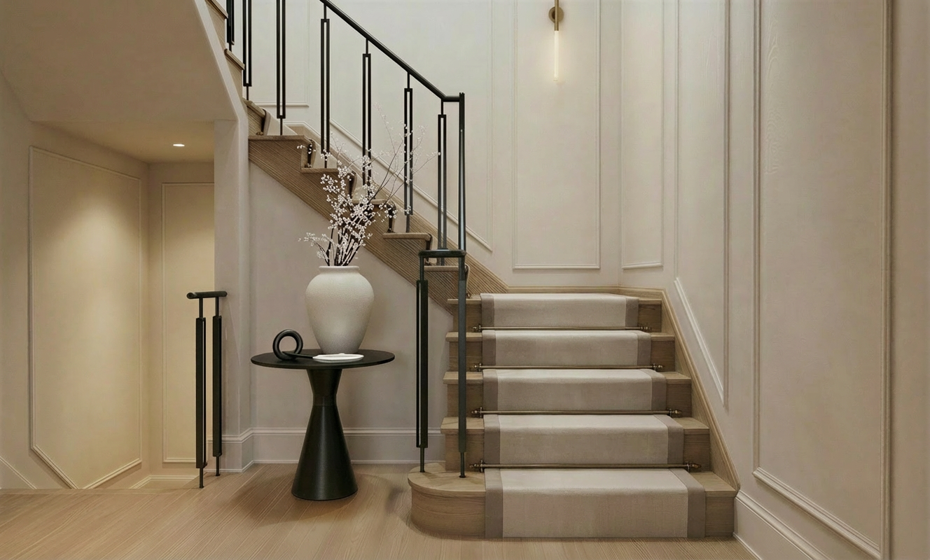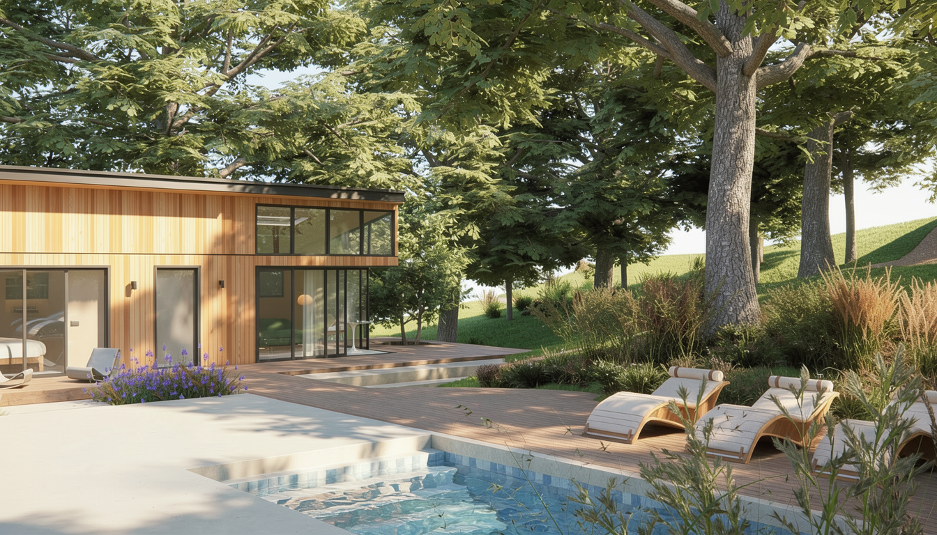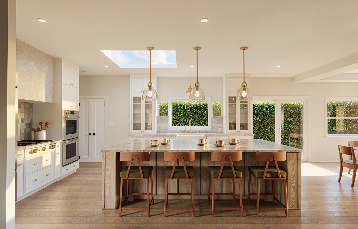bring life to this rendering with elegant details that fit the feeling of a serene kitchen in the morning with simple elements and 2 steaming coffee mugs the outside past the windows is a small patio walkway and a large hedge bush with the sky above there should only be two steaming coffee mugs and a calm centerpiece in the center of the kitchen island