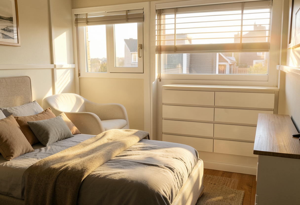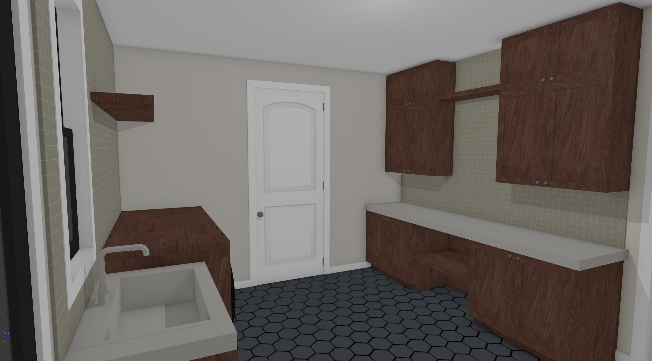 show this home as a photorealistic rendering keep exact architectural details add a rug on the floor clothes hamper on the shelf under the counter clothes hanging under the upper shelf between the cabinets