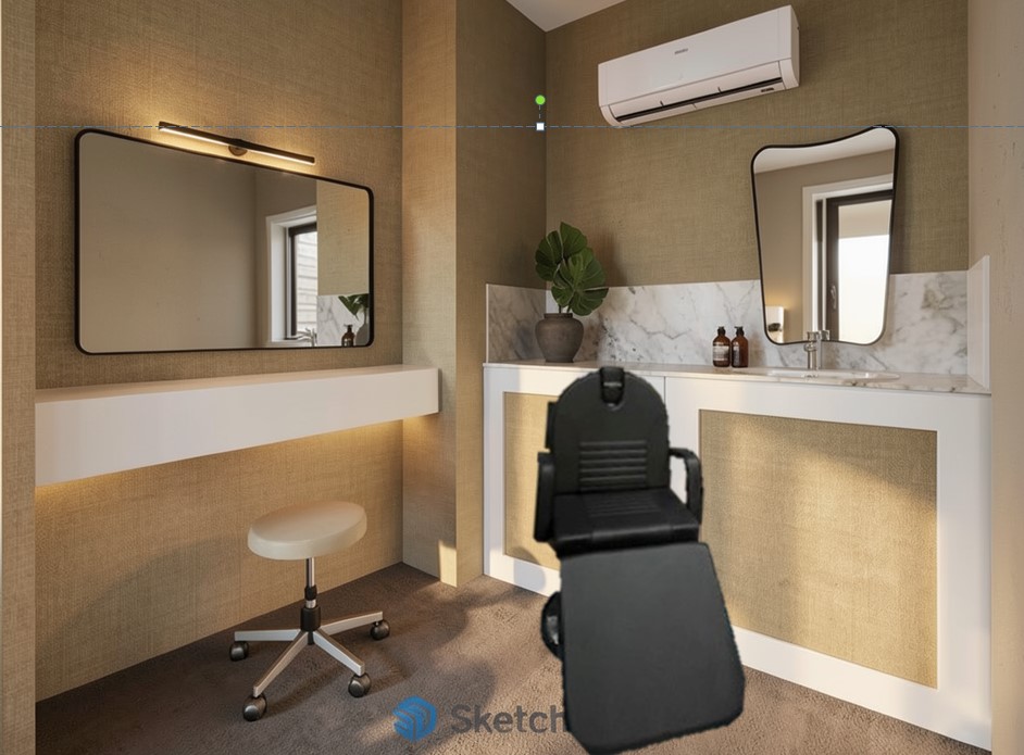 sistema la sedia con le spalle al mobile dove ce il lavandino messa per obbliquio non che guarda me mettila della proporzione giusta illumina la stanza con luce calda led