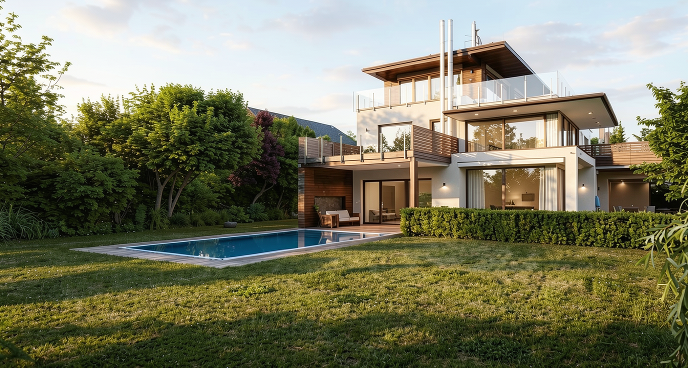 create a rendering of this home it is a luxury asset do not change the architecture and materials just enhance the image quality we have to sell it the daylight should be warmer and not more do not change the garden all the windows doors at the garden level do not have the blinds down