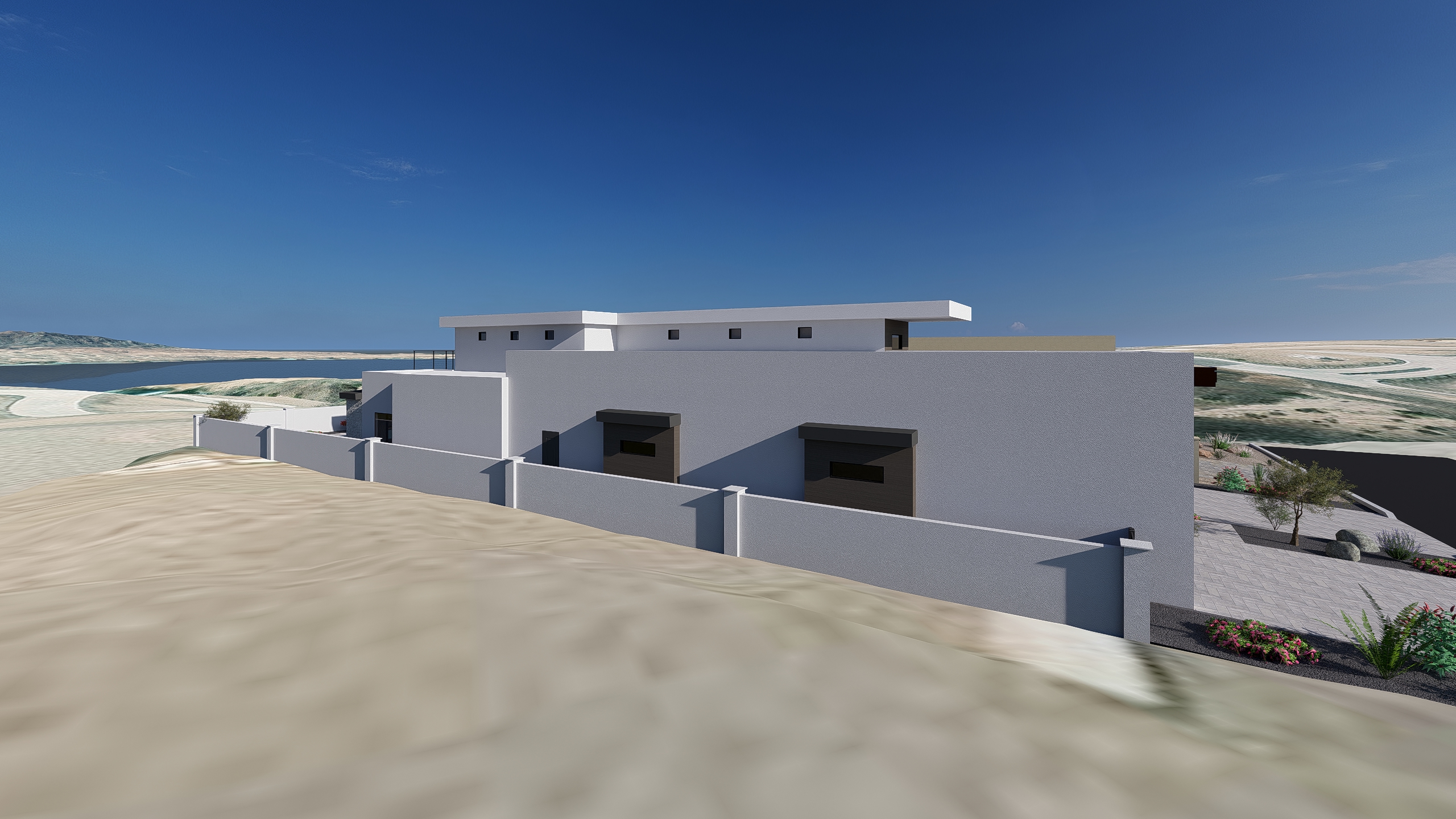 maintain all my colors the house is in the lake havasu city riviera you do have a view of the lake in this scene in the left side of the image a little bit enhance the desert to look more native to lake havasu city with dirt and small rocks and tumbleweeds keep lighting as if it is noon