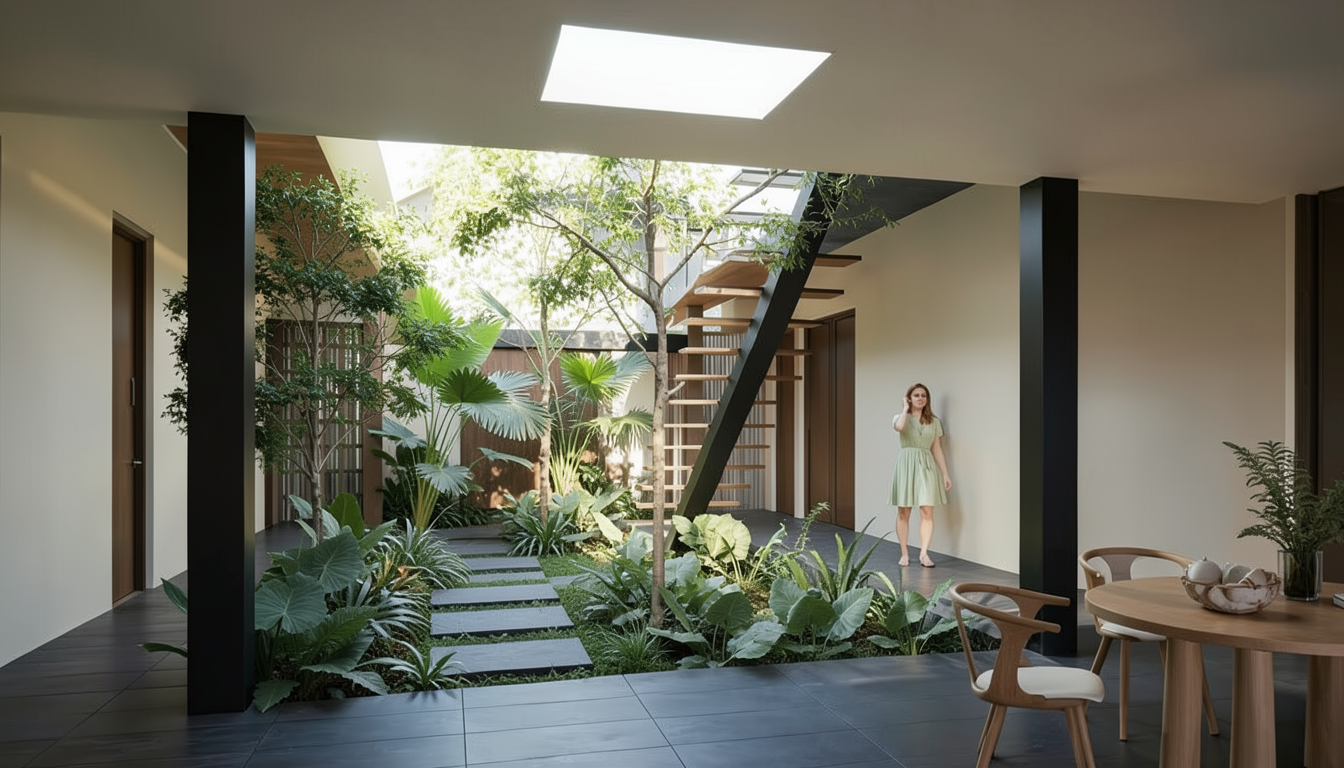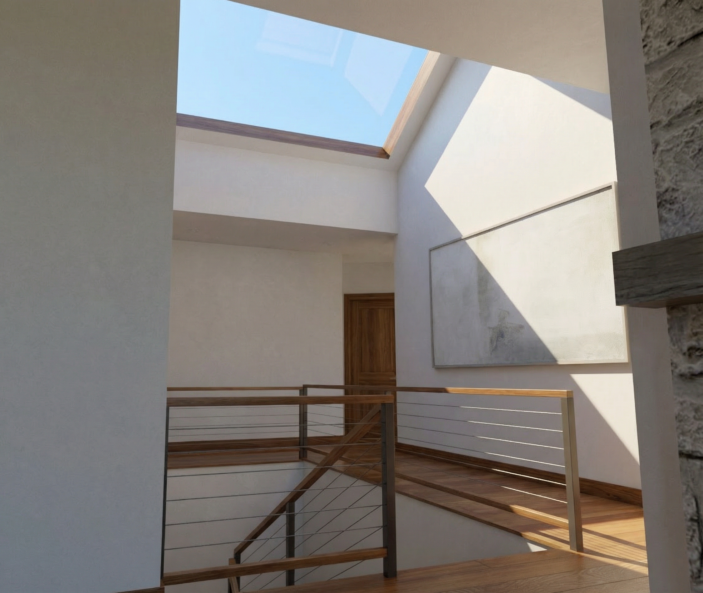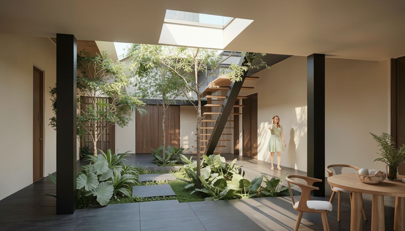 design a 1 200 square foot pavilion located in selma alabama situated near a riverfront setting with a contextual relationship to the historic surroundings the architectural concept should blend vintage historic character with modern industrial design the front fa ade and approximately one third of one side of the building should feature traditional red or warm toned brick expressing a classic historic southern aesthetic this portion includes the main public facing elements aluminum storefront systems with glass entry doors and a concessions service window integrated into the brick fa ade on the brick portion of the side elevation the one third brick side incorporate large vertically scaled black metal lettering spelling the hub with the word the positioned above hub in a stacked arrangement the signage should be backlite and feel bold industrial and integrated into the architecture the remaining two thirds of the building rear and side elevations should transition into a modern industrial expression these elevations should consist primarily of full height glass storefront systems framed in black metal creating transparency and strong indoor outdoor connectivity toward the river incorporate black metal wrapped structural columns along these glazed fa ades to emphasize rhythm and vertical articulation above the glass storefront systems include warm wood paneled transoms to soften the industrial character and introduce natural material contrast the roof is a metal butterfly roof with matching black metal soffits reinforcing the modern industrial aesthetic while maintaining durability interior the space should be minimally furnished with only simple tables and chairs no additional furniture cabinetry or built in elements emphasizing openness and simplicity material palette primary brick glass black metal secondary warm natural wood accents burnished cmu interior design intent the pavilion should feel inviting open and civic oriented with a strong visual connection to the riverfront and surrounding landscape lighting soft natural daylight with warm interior glow in early evening renderings warm exterior lighting at the concessions entry doors and roof soffits