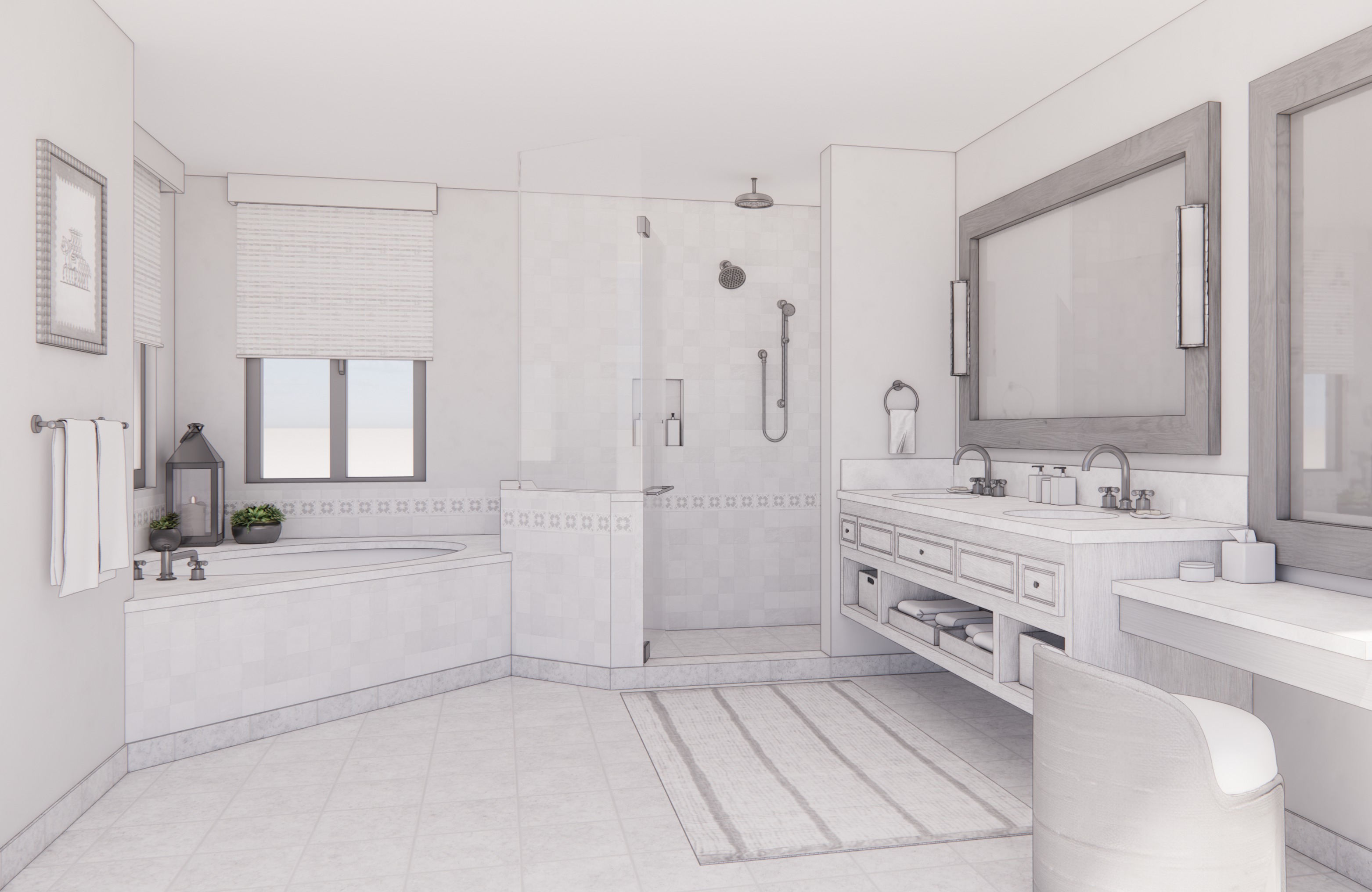 all metal hardware to be brushed graphite finish flooring is honed deserto rosato travertine with tumbled edge tile not glossy wood finish is aged white oak countertop and tub deck are leathered taj majal stone mirror frames are black wood walls are white plaster with soft edges